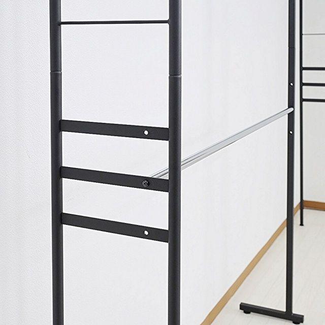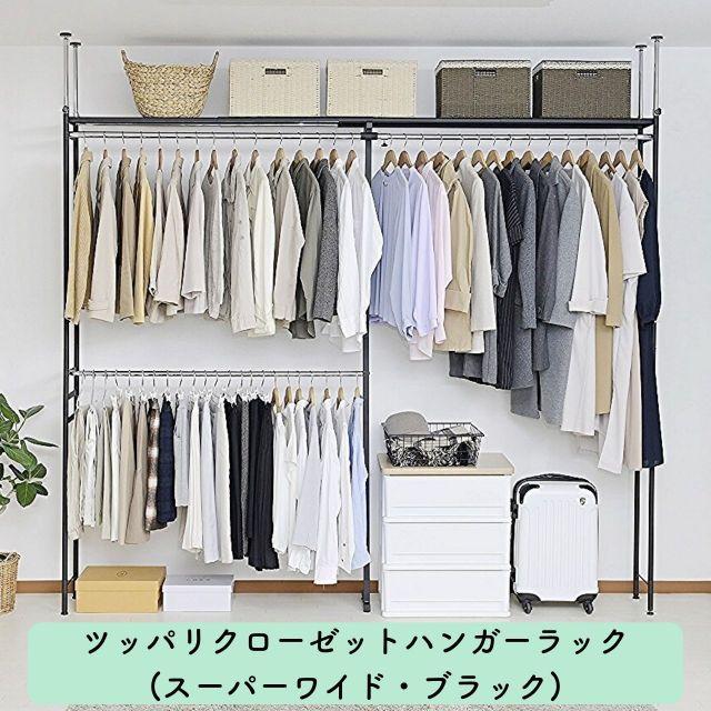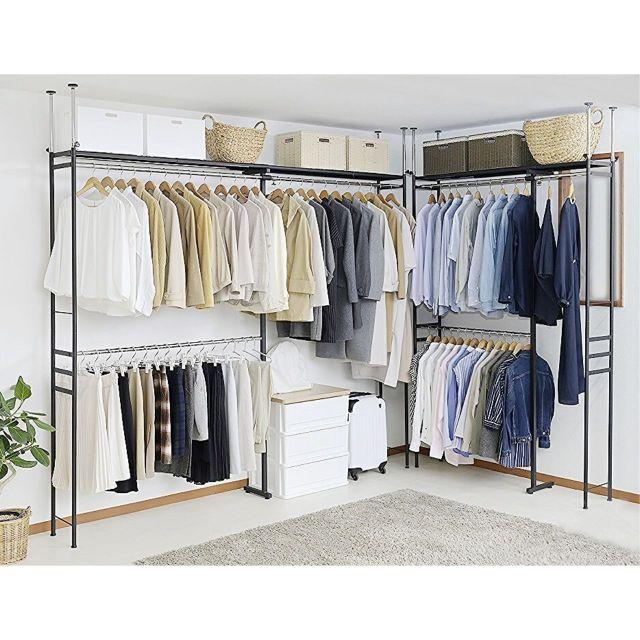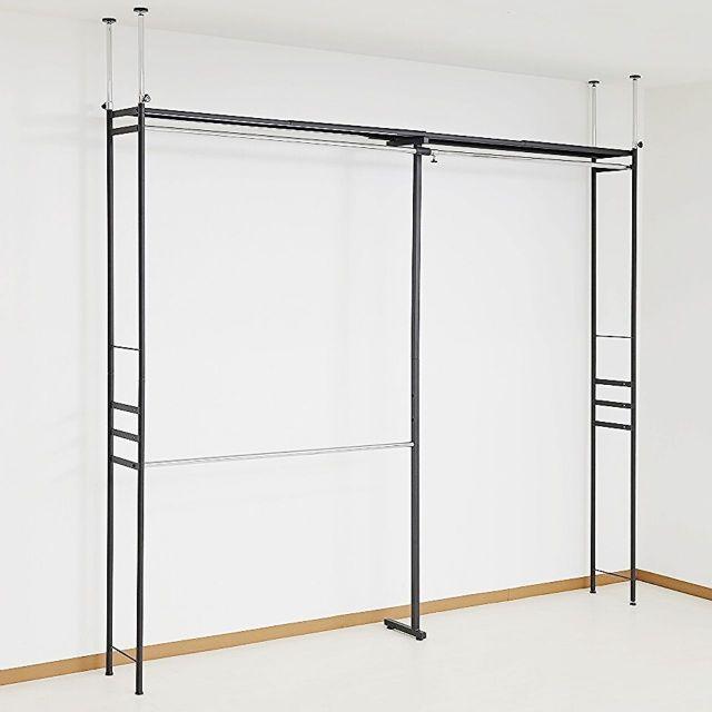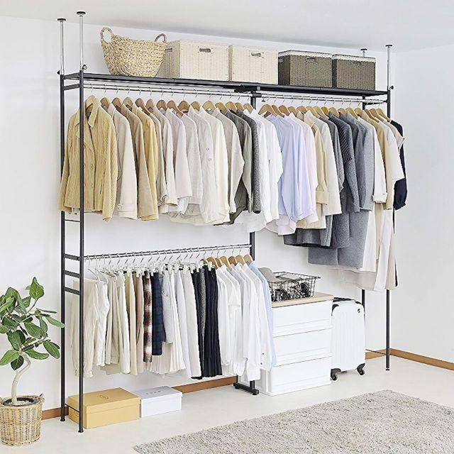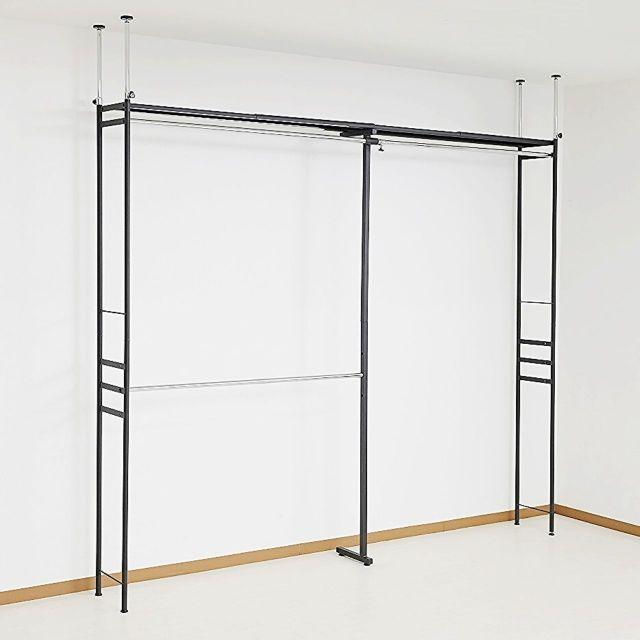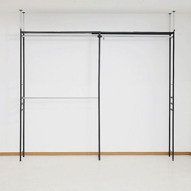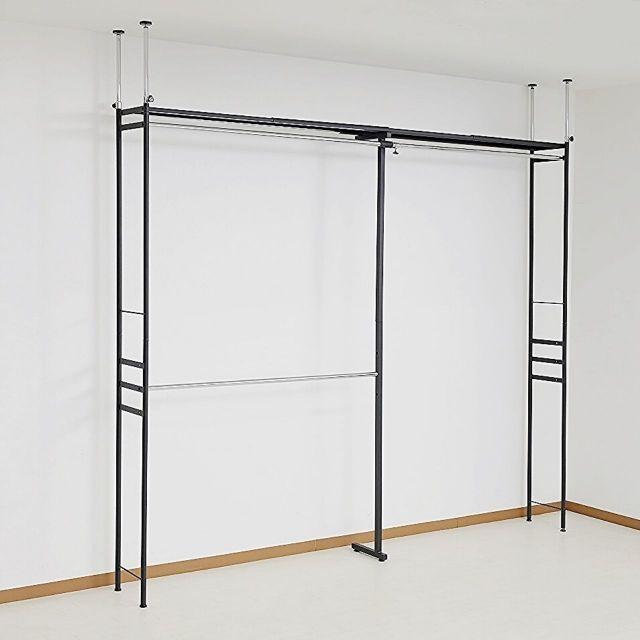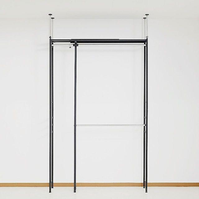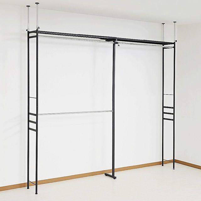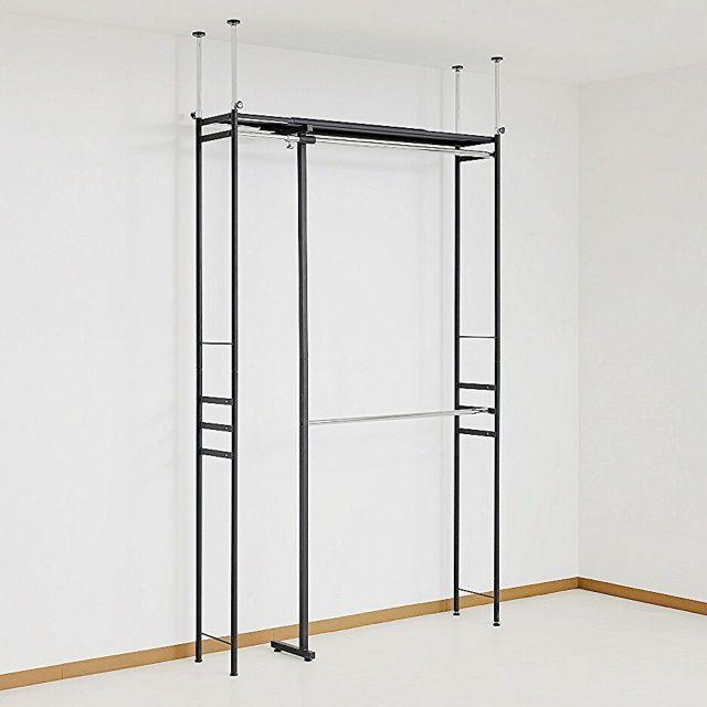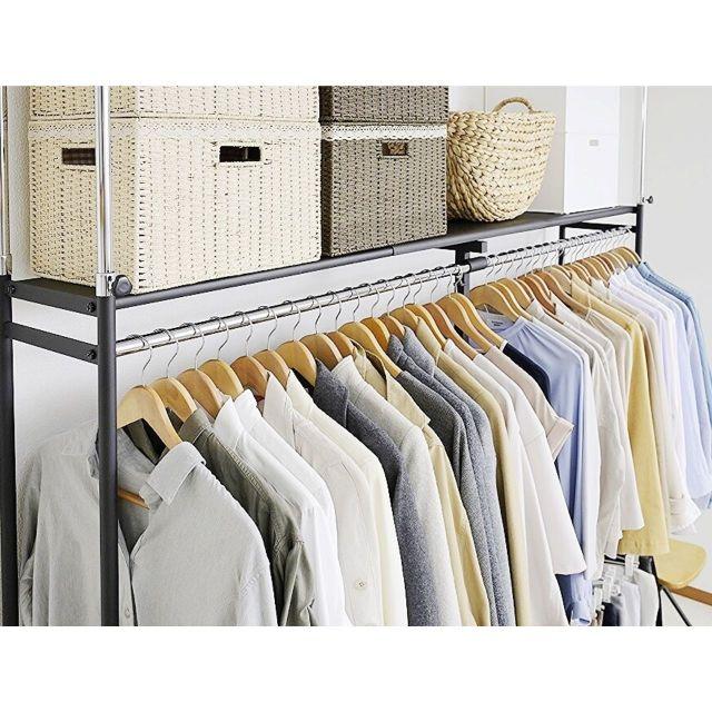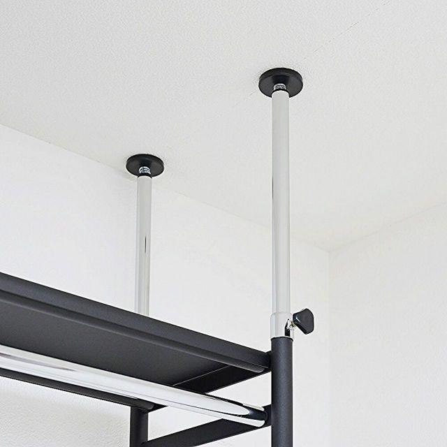 ●奥行きがスリムタイプでウォークインクローゼットや納戸にも簡単設置!!●衣類はもちろん、上段のスチール棚にはケース類やバッグ等、天井いっぱいまで空きを残さずたっぷり収納出来ます。●縦にも横にも伸縮するので設置場所を選びません。天井面の突っ張りパイプは前後それぞれ別に伸縮するので、下がり天井(梁)など、前後に段差があってもしっかり設置出来て安全です。