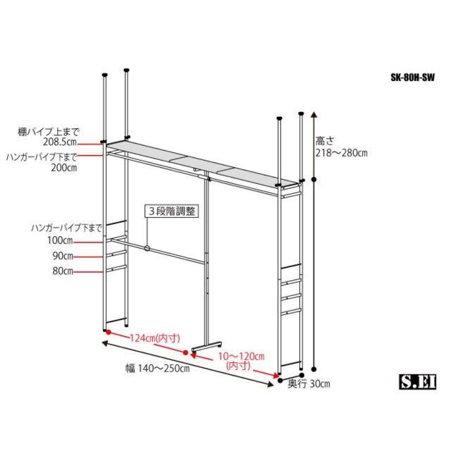 〈製品規格〉■商品サイズ(約):W140〜250×D30×H218〜280cm■商品重量(約):17.5Kg■耐荷重(約):耐荷重135kg(上段60Kg/下段15kg/棚60Kg)■素材・成分:本体…スチール(クロムメッキ・粉体塗装)■お客様組み立て商品