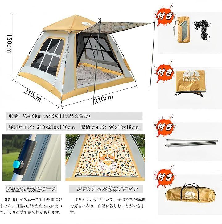 テントのサイズは210x210x150cmで、2~4人が収容可能で、家族でのキャンプに最適です。