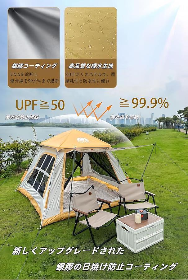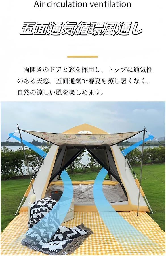 テントのサイズは210x210x150cmで、2~4人が収容可能で、家族でのキャンプにぴったりです。