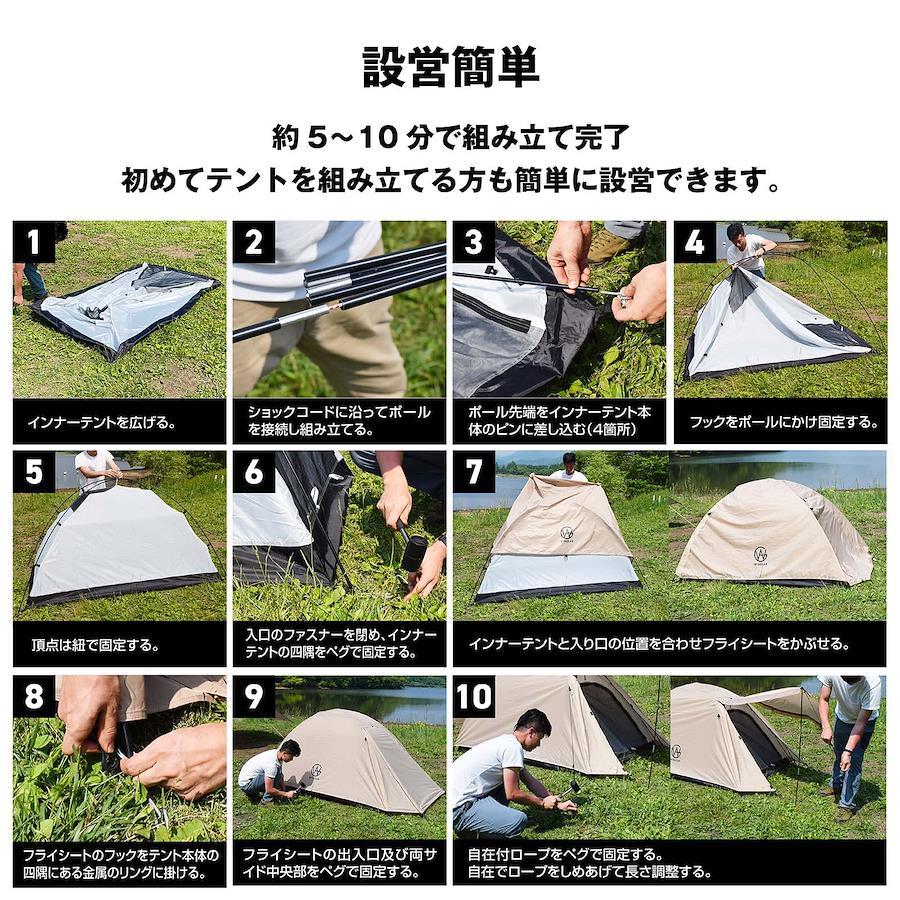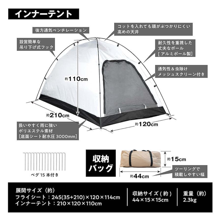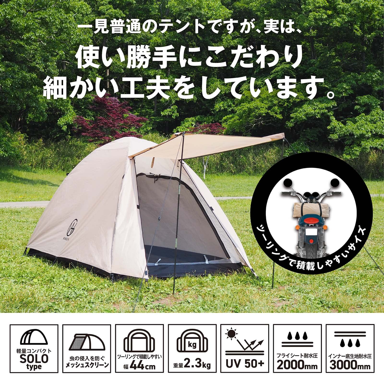 【ツーリング対応サイズ!】バイクや自転車への積載に対応できる収納時幅44cmのテントです。重量も約2.3kgなので、一人で全ての荷物を運ばなければならないソロキャンパーの方にも負担になりにくい軽さにこだわりました。【安心して使える品質】メインポールは耐久性を重視した丈夫なアルミ製を採用、長く使える丈夫さにこだわりました。自立式クロスポール型のテントは防風性に優れ、【約5分~10分で設営簡単】テントの設営に不慣れでも立てやすい自立式クロスポール型のテント。テントをペグで固定するだけの簡易設置の目安は5分、ロープも使ってしっかり固定する場合の目安は10分です。【居住性にこだわり】従来のソロテントより天井を高く設定、コットを入れても頭上がぶつかりにくい高さにしました。インナーテントはメッシュスクリーン付きで虫の侵入を防ぎ通気性抜群です。靴や荷物を置ける前室付き。【使い勝手にこだわり】小物入れポケット付きでテント内で失くしがちなスマホなどの収納ができます。ランタンフック付きで夜のキャンプも安心です。【紫外線カット&耐水加工】紫外線カット加工を施しています。(UV50+)生地の表面は撥水加工処理済みで、フライシートの耐水圧2000mm、インナーテント底面シート耐水圧は3000mmと高い耐水性があります。(一般傘の耐水圧は500mm程度)雨の日のキャンプも楽しめます。【様々なシーンで活躍】コンパクトに収納できるので、ソロキャンプ、交通機関を使った徒歩キャンプ、ツーリング、サイクリング、もしもの備えなどに持ち運び便利です。