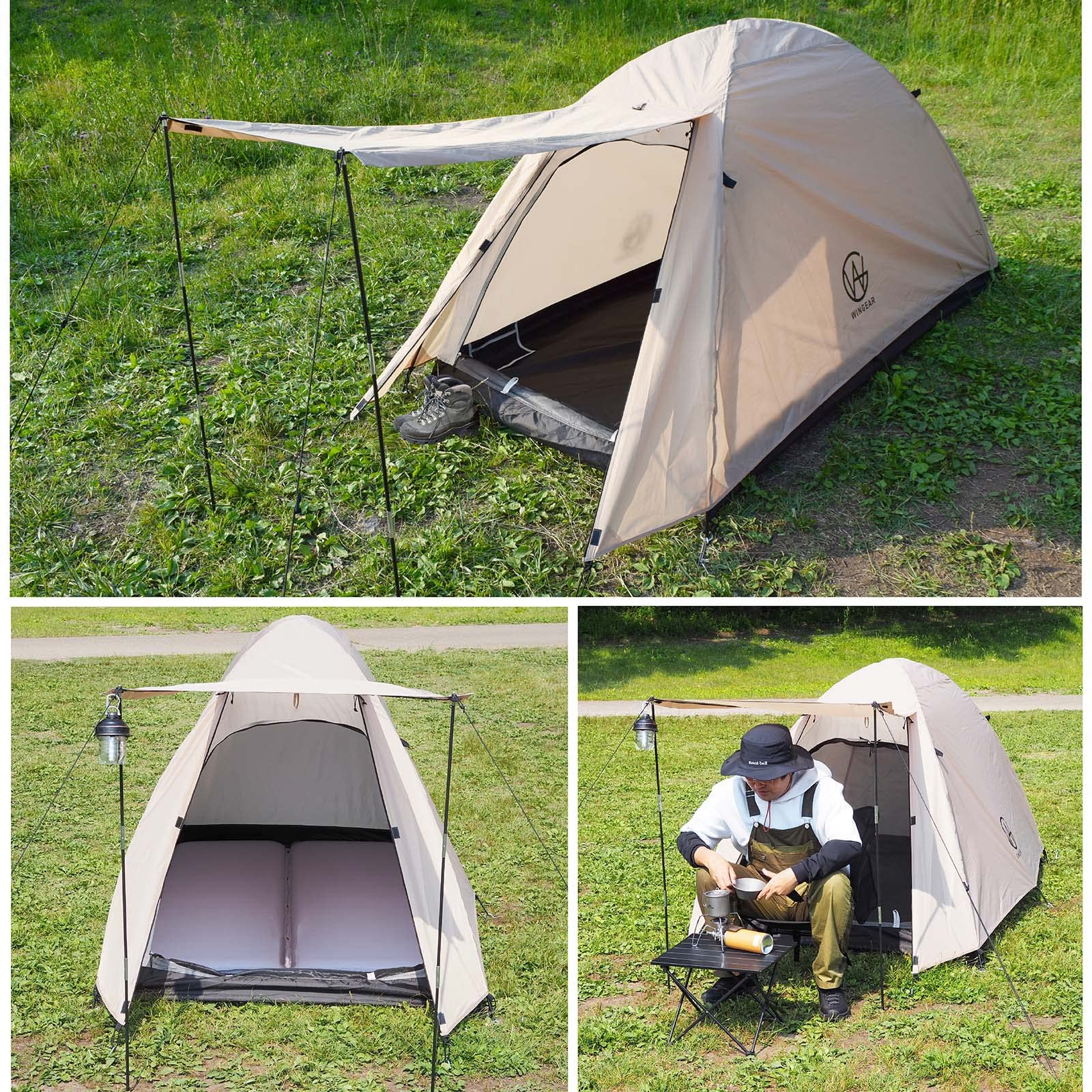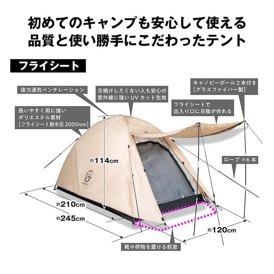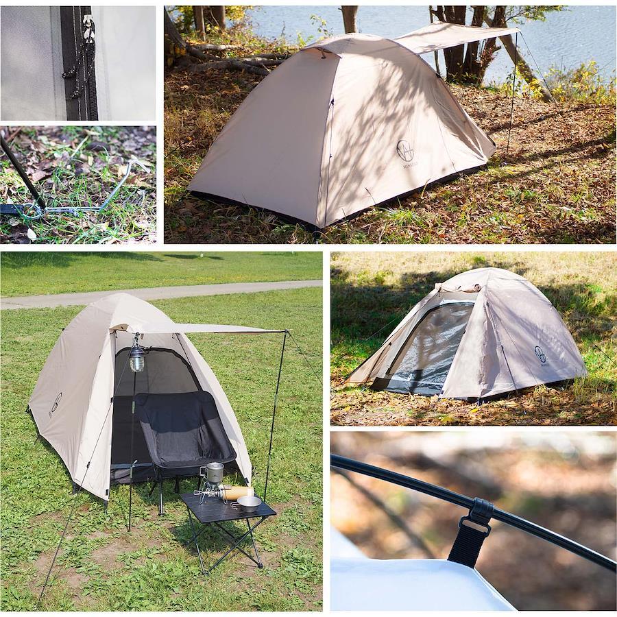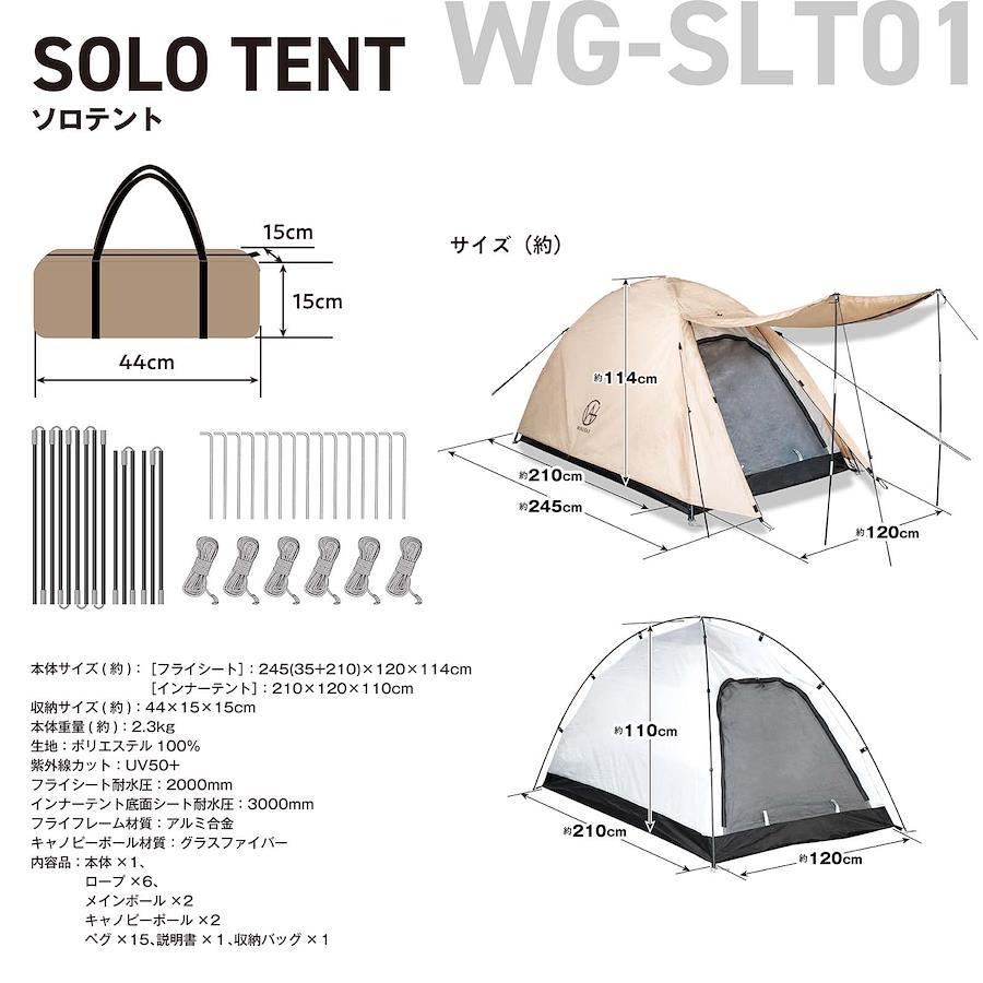 【ツーリング対応サイズ!】バイクや自転車への積載に対応できる収納時幅44cmのテントです。重量も約2.3kgなので、一人で全ての荷物を運ばなければならないソロキャンパーの方にも負担になりにくい軽さにこだわりました。【安心して使える品質】メインポールは耐久性を重視した丈夫なアルミ製を採用、長く使える丈夫さにこだわりました。自立式クロスポール型のテントは防風性に優れ、【約5分~10分で設営簡単】テントの設営に不慣れでも立てやすい自立式クロスポール型のテント。テントをペグで固定するだけの簡易設置の目安は5分、ロープも使ってしっかり固定する場合の目安は10分です。【居住性にこだわり】従来のソロテントより天井を高く設定、コットを入れても頭上がぶつかりにくい高さにしました。インナーテントはメッシュスクリーン付きで虫の侵入を防ぎ通気性抜群です。靴や荷物を置ける前室付き。【使い勝手にこだわり】小物入れポケット付きでテント内で失くしがちなスマホなどの収納ができます。ランタンフック付きで夜のキャンプも安心です。【紫外線カット&耐水加工】紫外線カット加工を施しています。(UV50+)生地の表面は撥水加工処理済みで、フライシートの耐水圧2000mm、インナーテント底面シート耐水圧は3000mmと高い耐水性があります。(一般傘の耐水圧は500mm程度)雨の日のキャンプも楽しめます。【様々なシーンで活躍】コンパクトに収納できるので、ソロキャンプ、交通機関を使った徒歩キャンプ、ツーリング、サイクリング、もしもの備えなどに持ち運び便利です。