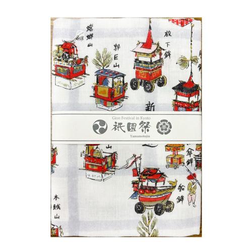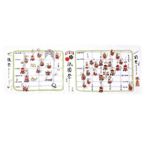 祇園祭の前祭りと後祭の山鉾町を左右に分けて描いた洛中図です。ふんわりガーゼ素材に細やかに山鉾が描かれており、祇園祭を楽しんでいただける手拭いです。(イラスト:もりゆか)