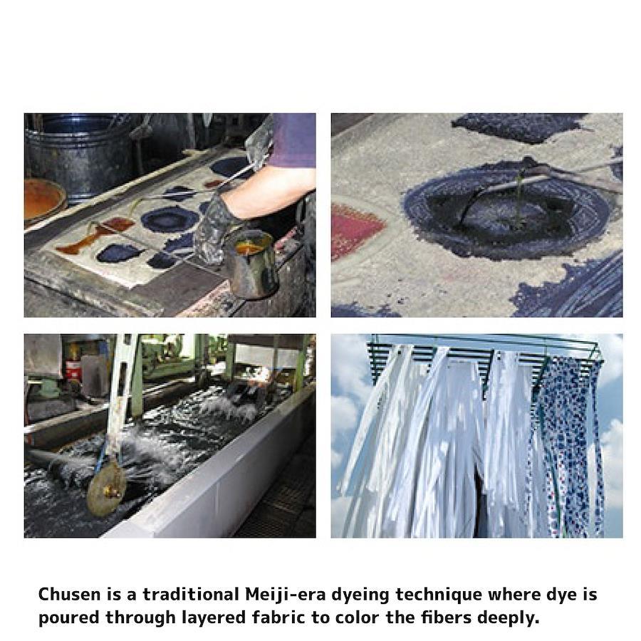 注染(ちゅうせん)は、日本独自の伝統技法で、染料を布に注ぎ込むことで裏表なく鮮やかに染まるのが特徴。にじみやぼかしの美しさは、機械染めでは再現できない手仕事ならではの味わいです。