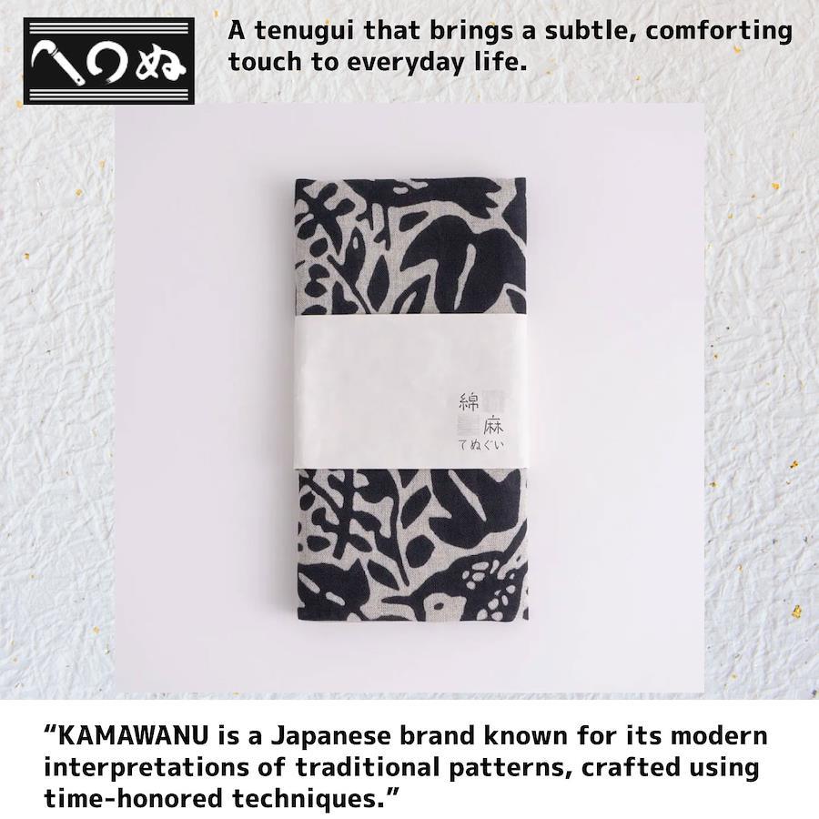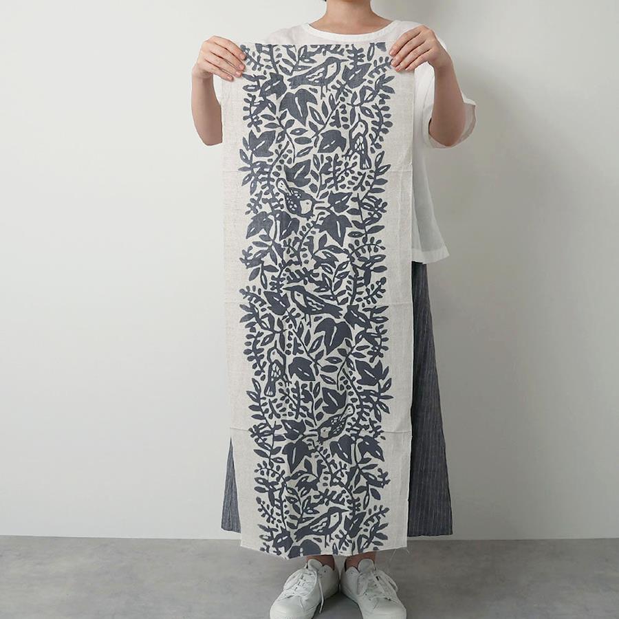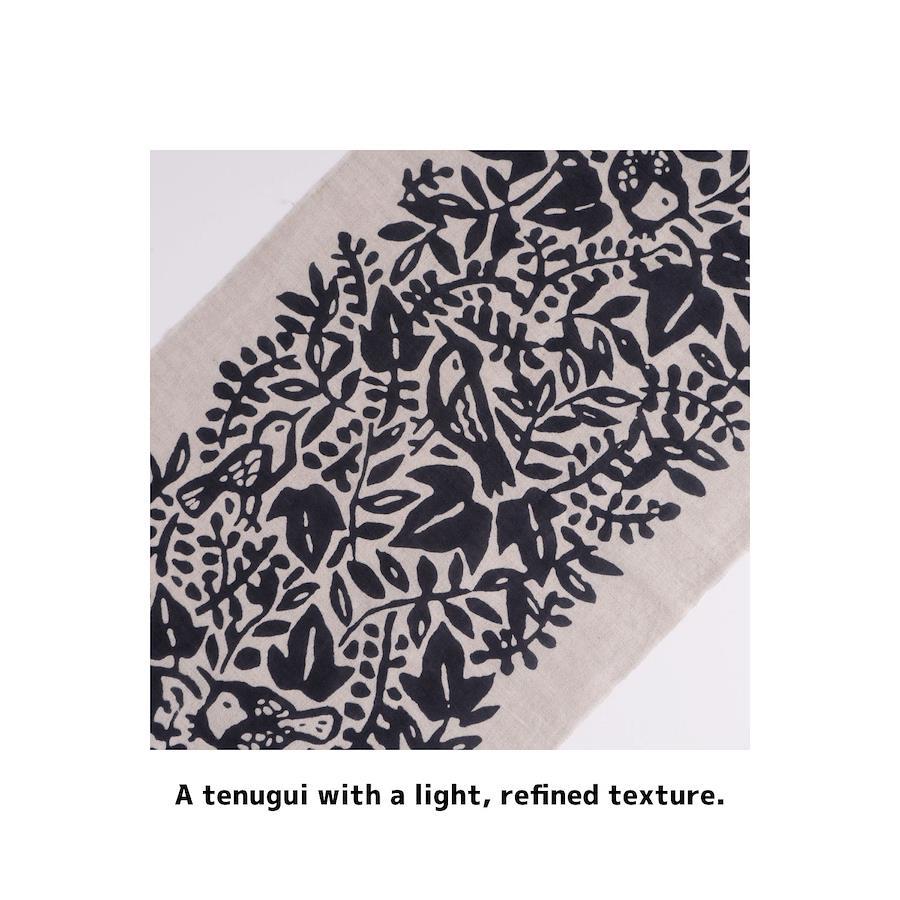 たて糸を綿、横糸を麻で織った綿麻生地の手ぬぐいです。鳥と唐草模様が織りなすデザインは、和の趣を感じさせつつも、モダンな印象を与えます。