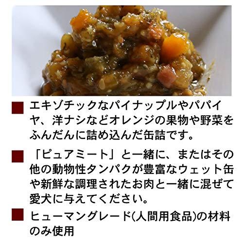 トッピングシリーズのガーデンベジタブルはザクザクと切った野菜や色とりどりの果実をブレンドミックスしたウェットタイプです。愛犬に必要なビタミン・ミネラル・アミノ酸が大変豊富です。低カロリーで、野菜や果物は全て裁断、調理・裏ごしをする事により、消化に優しい缶詰となっています。 ピュアミートと一緒に混ぜたり、お肉と一緒に混ぜて愛犬に与えてください。