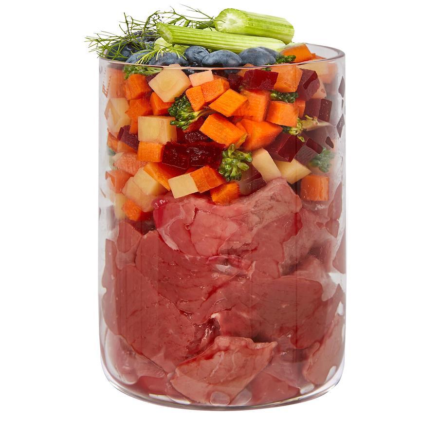 牛の心臓の筋肉(43%)、牛の筋肉(グヤーシュ肉)(16%)、にんじん(11%)、じゃがいも(9%)、ブロッコリー(4%)、ビーツ*、さつまいも、リンゴ、フェンネル(2%)、ブルーベリー(0.5%)、レープシードオイル、ココナッツ粉、ビール酵母*、オイスターシェル*、セージ*(0.1%)、タラゴン*(0.1%)、ハイビスカス(0.1%)、チャービル*(0.1%)、ゴマ*、ミネラルクレイ*、アンデスソルト、海藻*、ミネラル類 *乾燥