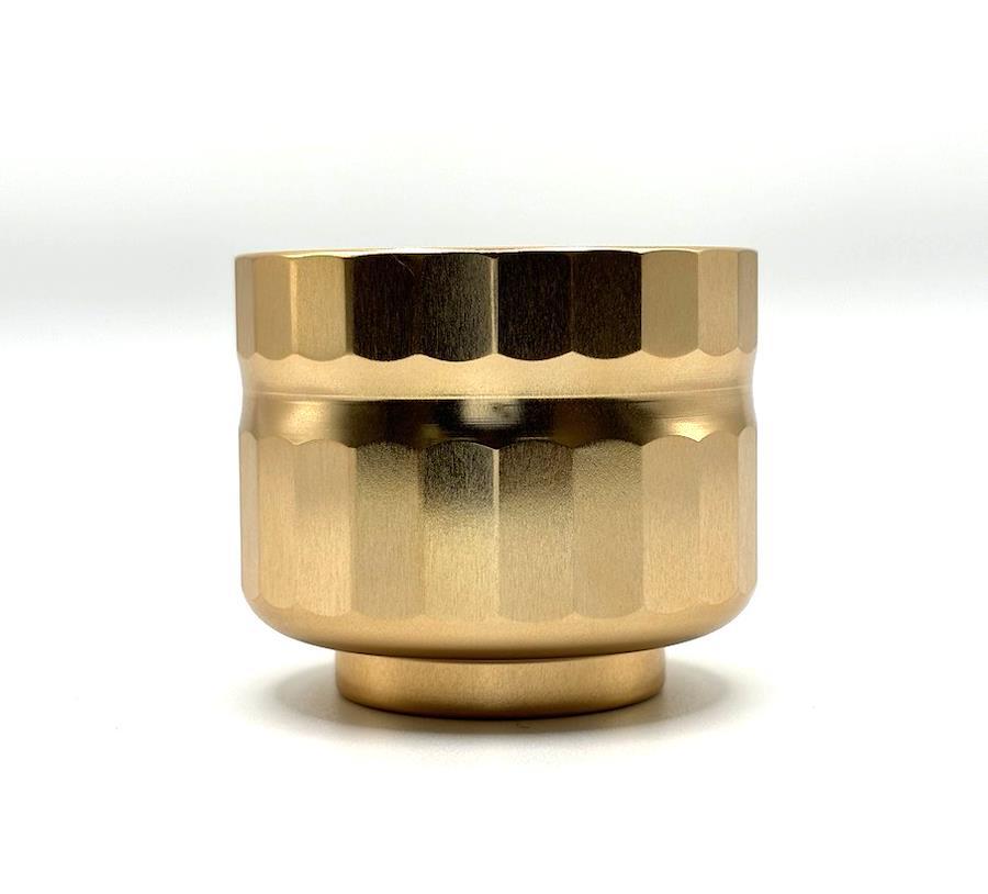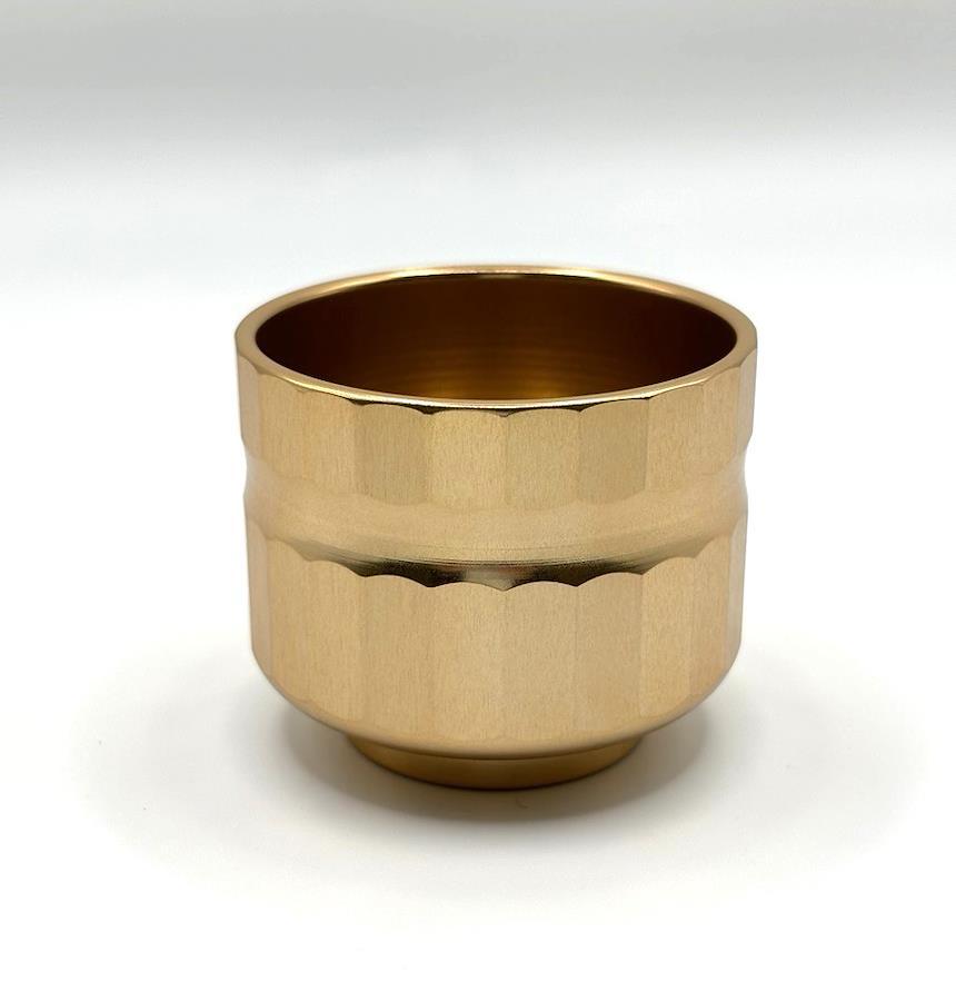 材 質: ジュラルミン(アルミニウム合金)容 量: 50ml重 量: 約53gサイズ: 約φ50 x 高さ40(mm)加工方法: マシニングセンター 削り出し加工表面処理: カラーアルマイト色 : Gold系