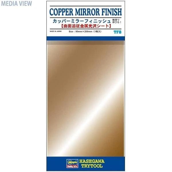 ハセガワ(Hasegawa) カッパーミラーフィニッシュ 20x9x0.2cm TF8 曲面追従金属シートは、柔軟な蒸着シート。「銅色」でしかも「鏡」のようなメタリック感と曲面への追従性を実現しました。塗装ではできなかった金属表現にとても有効です。シートは「極薄」で、さらに「伸びる」ため、曲がった面への密着にすぐれ、高価な「銅製品」のように仕上げられます。使用用途:空冷エンジンを搭載した大戦中のイギリス機は、カウリング先端が銅色に輝く耐熱板。フォーミュラーカーでは車輪に回転を伝えるドライブシャフトの表現。キャラクターモデルの彫刻やアクセサリーをカッパーミラー仕上げ。鉄道の旧車輌、歴史建物、帆船など、塗装ではできなかった「銅色」の表現にお使いください。
