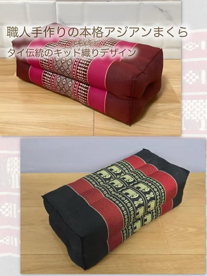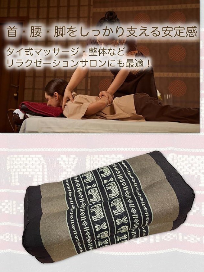 タイ古式マッサージの枕としても使われるデザインで、マッサージ中の頭・首・脚・腕の支えにぴったり。