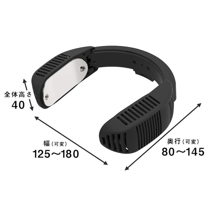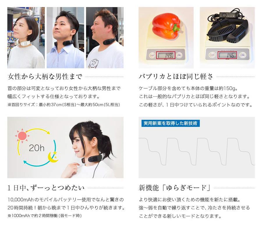 ================================サイズ:最小:幅 125× 高さ 40× 奥行 80mm 最大:幅180×高さ40×奥行145mm重量:約150g首周りサイズ:最小:約37cm 最大:約50cm電源:USBバスパワー 5V/1Aモード:強モード/弱モード/ゆらぎモード温度(冷却プレート)?:強モード:外気温よりー10~ー15℃ 弱モード:外気温よりー5~ー10℃ケーブル長:本体からスイッチまで:約38cm スイッチからUSBまで:約65cm使用時間(強モード使用時):約5時間(5,000mAh) 約10時間(10,000mAh) 約20時間(20,000mAh)※モバイルバッテリー(別売)の容