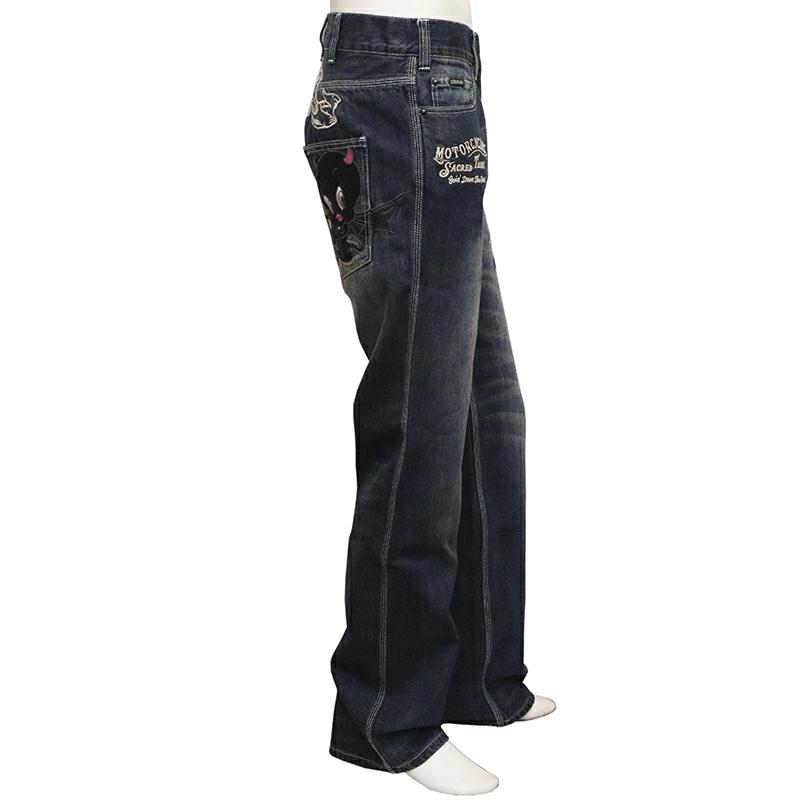 ヒップにはブランドロゴ等をし、右ポケットに黒い悪魔になった姿を、左ポケットにゴーグルを付け翼を生やした姿を。
