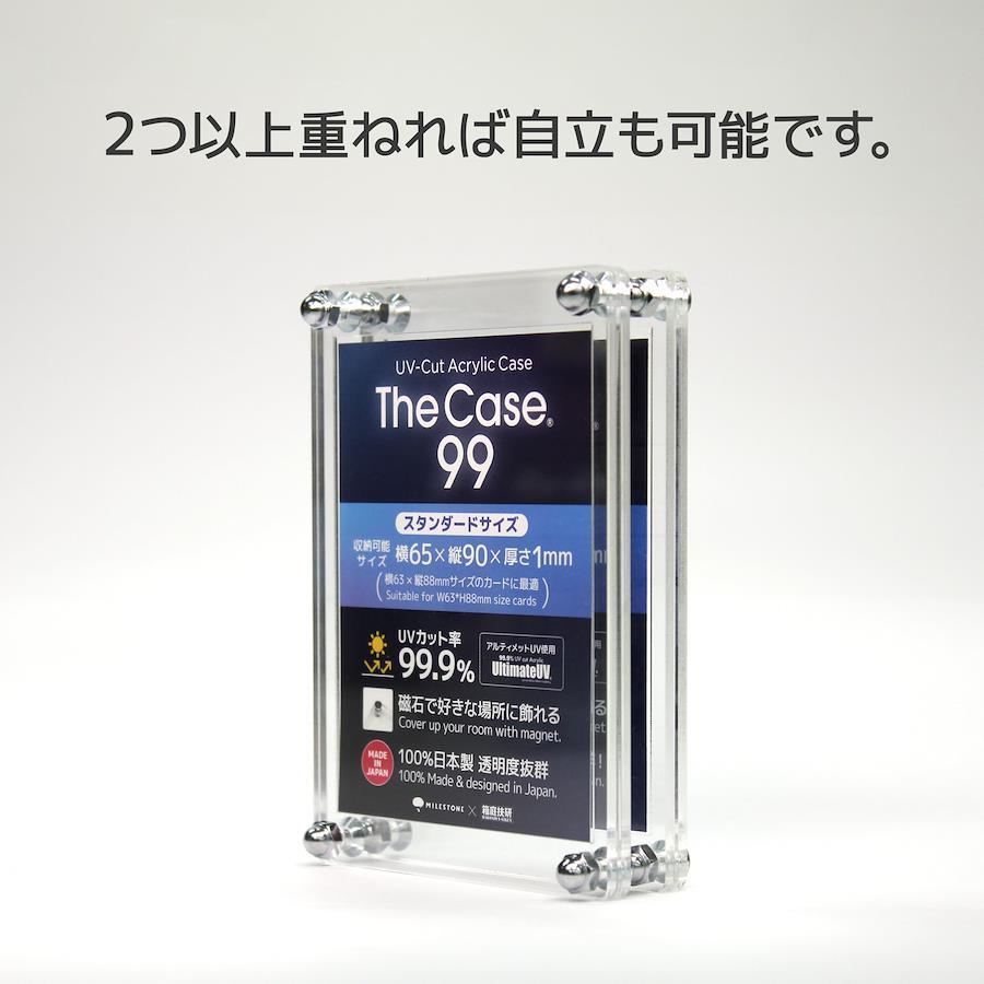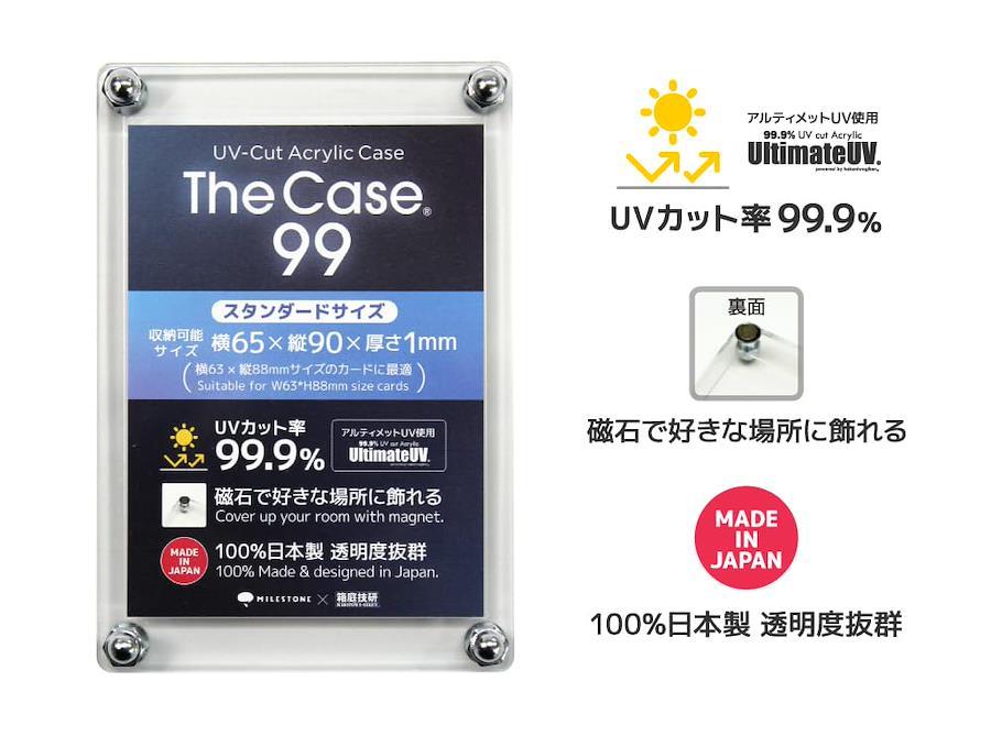 通常1-5営業日で発送【新品未開封品】「飾ライフ」シリーズ、UVカット率99.9%のアクリルカードケース『The Case 99』。スタンダードサイズ「横63×縦88mm」のトレーディングカードに対応(インナースリーブ対応)。「横65×縦90×厚み1mm」サイズまで収容可能。大切なカードを紫外線からしっかりと守ります。※99.9%UVカットアクリルの「Ultimate UV」を使用。背面にデフォルトで磁石が付属しているため、磁力が吸着できる好きな場所に飾ることができます。日本製アクリルのため透明度は抜群。カードをより高級に魅せ、コレクションをさらに楽しめます。2つ以上重ねれば自立するので、ディスプレイも保管も可能です。
