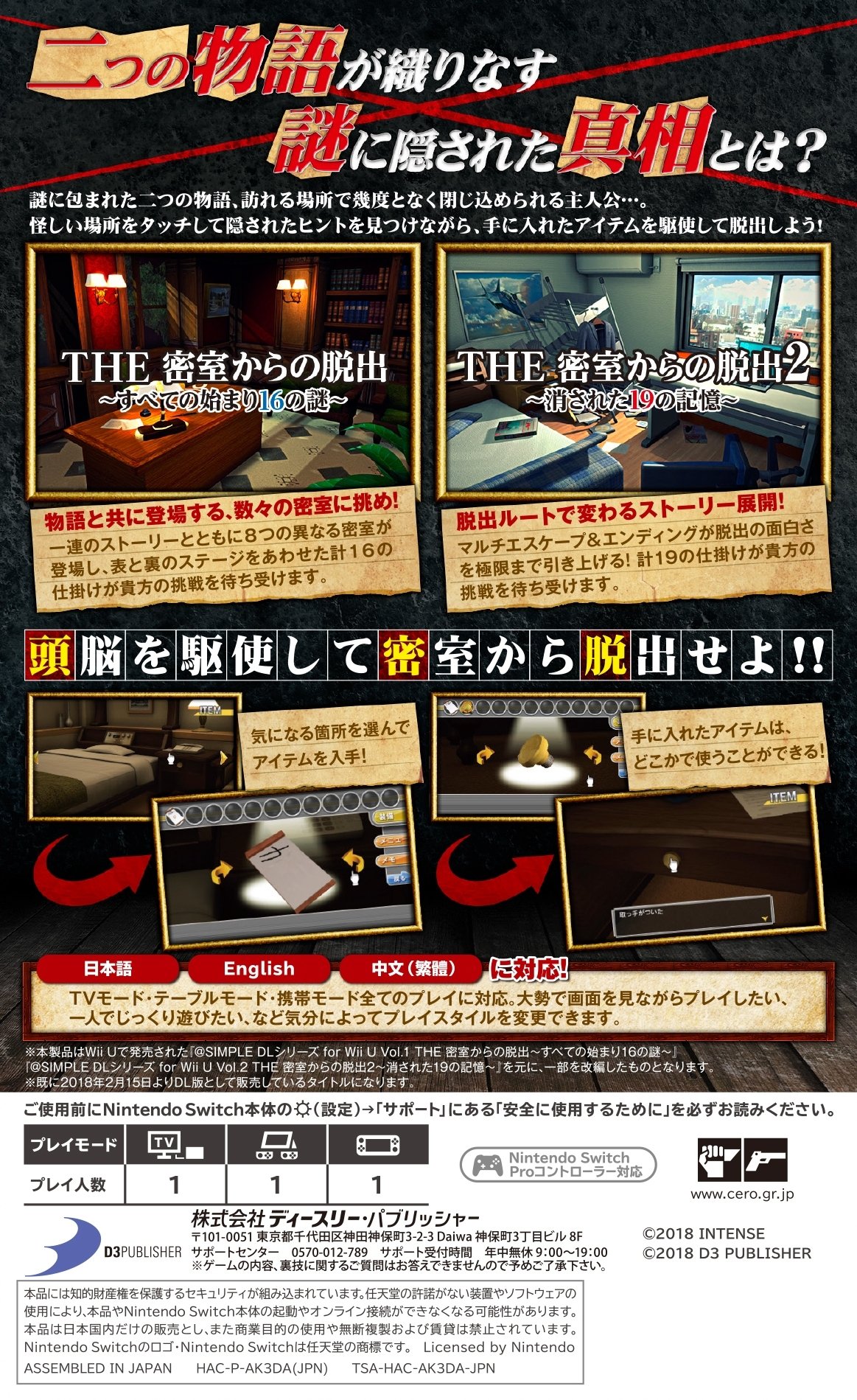 「密室からの脱出」シリーズ累計130万本以上販売! ! ついに、NintendoSwitch登場! 二つの物語が織りなす謎に隠された真相とは?