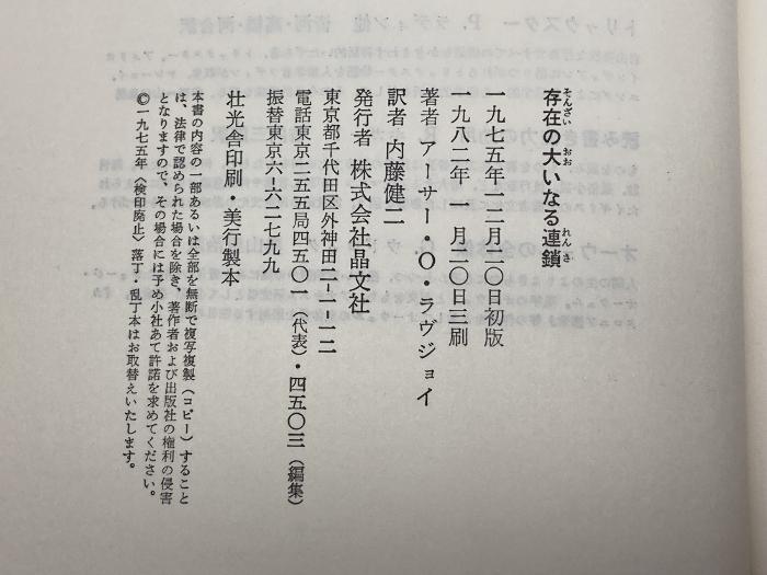 商品名:存在の大いなる連鎖 (晶文全書) 晶文社 アーサー ラヴジョイ