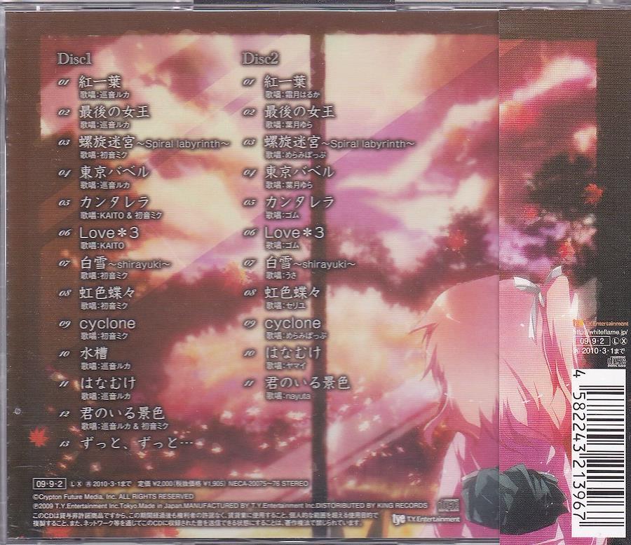 「紅一葉」をCD1枚目では巡音ルカ、CD2枚目では霜月はるかが歌い、「カンタレラ」をCD1枚目ではKAITO、CD2枚目ではゴムが歌い上げる公開楽曲のリアレンジ、リマスタリングバージョンを収録。さらに新曲を加え、VOCALOID Disc 13曲、VOCAL Disc 11曲の2枚組全24曲収録
