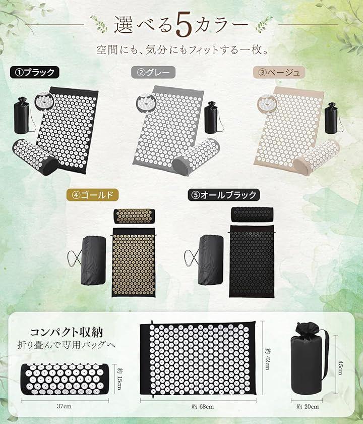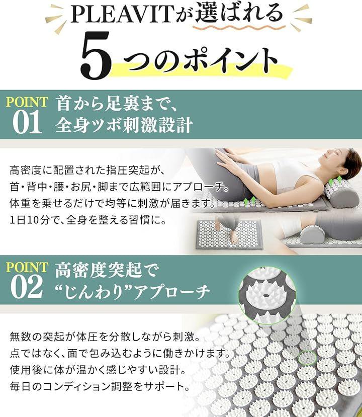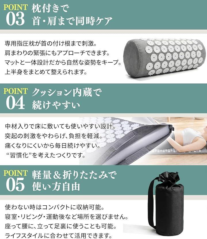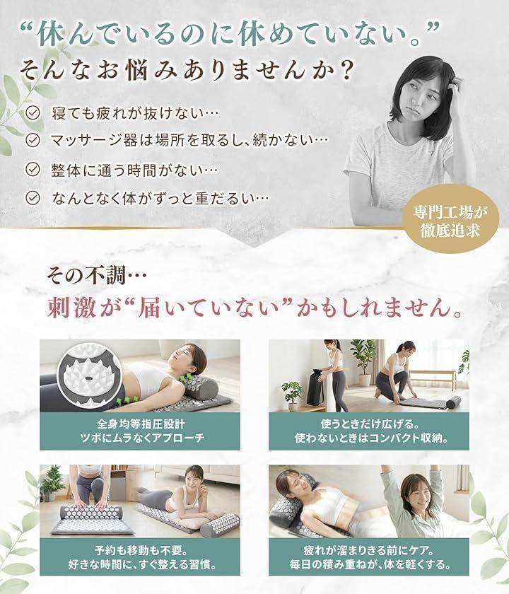 マットにびっしりと並んだ指圧ポイントが、体に心地よい刺激を与えて、ゆったりとした時間へ導きます。