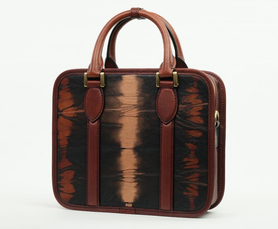泥染めホースハイド(キンショ)製のミニブリーフ「DERBY-MINI」です。日本の伝統的な技法で染めた革で製作した特別なミニブリーフです。外縫い仕様を用い、自立の美しさが目を引きます。