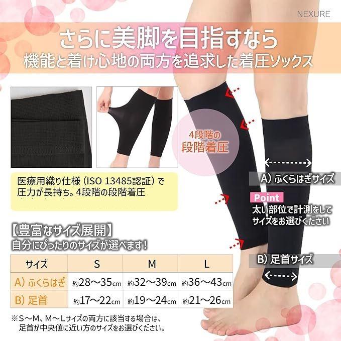 段階着圧機能: 医療用編み仕様の着圧ソックス(ISO 13485認証)。