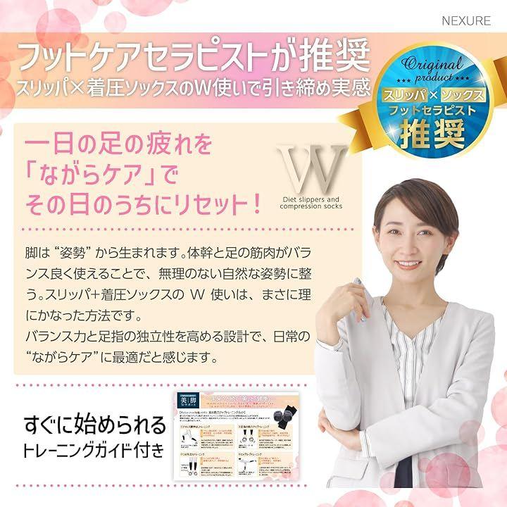 美脚サポート設計: ダイエットスリッパと着圧ソックスのWサポートで効果的な脚のケアを実現。
