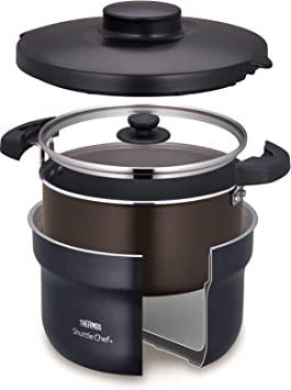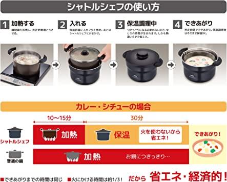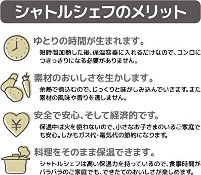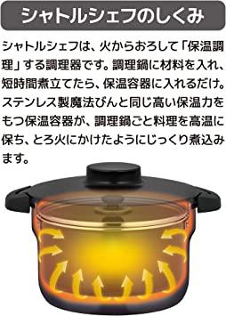 通常1-5営業日で発送:シャトルシェフは調理鍋に材料を入れ、短時間煮立て保温容器に入れるだけで「保温調理」ができる調理器です。/ステンレス製魔法びんと同じ高い保温力を持つ保温容器が、調理鍋ごと料理を高温に保ち、焦げ付きや煮崩れなく、とろ火にかけたようにじっくり煮込みます。/対応熱源:ガス火、電磁調理器 (IH 200V 対応)、電気プレート、ハロゲンヒーター、シーズヒーター、ラジエントヒーター/サイズ(約):幅30×奥行24×高さ19cm、本体重量(約):2.3kg、容量:2.8L/素材・材質:本体:アルミニウム合金/ ステンレス鋼(クロム18%)(底の厚さ2.9mm(はり底を含む))