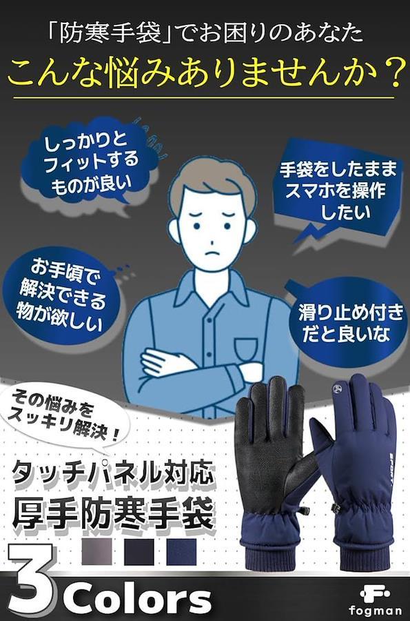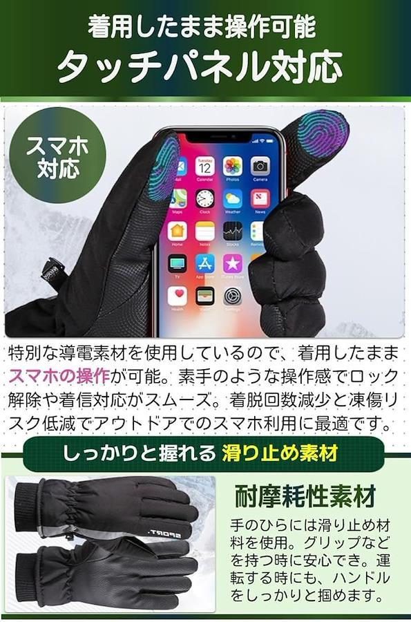 「商品特徴」(1)トリプル蓄熱設計:しっかり熱を閉じ込め暖かい/(2)収納に便利バックル:バックル付きで紛失の心配を軽減/(3)タッチパネル対応:手袋を着用したままでもスマホを触れる/(4)掌は全面滑り止め付き:対象物を滑らずにしっかりと握れる