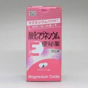 ■商品概要メーカー:健栄製薬商品名:酸化マグネシウムE便秘薬 360錠医薬品分類:第3類医薬品区分:OTC医薬品小児用区分:兼用薬剤形状:錠剤・丸剤・カプセル内容量:360錠商品概要:ミネラル成分(酸化マグネシウム)が腸内に水分を集め,便を柔らかくして膨らませ,お通じを促します。【使用期限】出荷時点で使用期限終了まで1年以上JANコード:4987286314051商品コード:076907363■初回添付文書作成年月および改訂年月、添付文書版番号初回作成:―改訂:―■特徴マグネシウムの作用で自然に近いお通じを…ミネラル成分(酸化マグネシウム)が腸内に水分を集め,便を柔らかくして膨らませ,お通じを促します。■お腹にやさしい非刺激性腸を直接刺激しないので,お腹が痛くなりにくい便秘薬です。■クセになりにくいミネラル成分(酸化マグネシウム)を使った便秘薬は,一般的にクセになりにくいと言われています。■服用量が調節できます症状に合わせて適切な分量を服用できます。■レモン風味の速崩錠水で服用すると,口中ですばやく崩壊し,ほのかなレモン風味が広がります。錠剤が苦手な方でも服用が容易です。■してはいけないこと守らないと現在の症状が悪化したり,副作用が起こりやすくなります)1.本剤を服用している間は,次の医薬品を服用しないでください他の瀉下薬(下剤)■相談すること1.次の人は服用前に医師,薬剤師又は登録販売者に相談してください(1)医師の治療を受けている人。(2)妊婦又は妊娠していると思われる人。(3)高齢者。(4)はげしい腹痛,吐き気・嘔吐のある人。(5)腎臓病の診断を受けた人。2.服用後,次の症状があらわれた場合は副作用の可能性があるので,直ちに服用を中止し,この文書を持って医師,薬剤師又は登録販売者に相談してください[関係部位:症状]消化器:はげしい腹痛,吐き気・嘔吐精神神経系:強い眠気,意識がうすれる循環器:立ちくらみ,脈が遅くなる呼吸器:息苦しいその他:筋力の低下,口のかわき3.服用後,次の症状があらわれることがあるので,このような症状の持続又は増強が見られた場合には,服用を中止し,医師,薬剤師又は登録販売者に相談してください下痢4.1週間位服用しても症状がよくならない場合は服用を中止し,この文書を持って医師,薬剤師又は登録販売者に相談してください■効能・効果便秘。便秘に伴う次の症状の緩和:頭重,のぼせ,肌あれ,吹出物,食欲不振(食欲減退),腹部膨満,腸内異常醗酵,痔■用法・用量次の量を就寝前(又は空腹時)に水又はぬるま湯で服用してください。ただし,初回は最小量を用い,便通の具合や状態をみながら少しずつ増量又は減量してください。[年齢:1回量:1日服用回数]大人(15歳以上):3~6錠:1回11歳以上15歳未満:2~4錠:1回7歳以上11歳未満:2~3錠:1回5歳以上7歳未満:1~2錠:1回5歳未満:服用しないでください用法関連注意(1)用法用量を厳守してください。(2)小児に服用させる場合には,保護者の指導監督のもとに服用させてください。(3)早い方は約1~2時間で効果があらわれるなど,効果発現までの時間に個人差があります。■成分・分量6錠中成分 分量酸化マグネシウム 2000mg添加物: ステアリン酸カルシウム,アセスルファムカリウム,結晶セルロース,クロスカルメロースナトリウム(クロスCMC-Na),香料■保管及び取扱上の注意(1)直射日光の当たらない湿気の少ない涼しい所に密栓して保管してください。(2)小児の手の届かない所に保管してください。(3)他の容器に入れ替えないでください。(誤用の原因になったり品質が変わることがあります。)(4)使用期限を過ぎた製品は服用しないでください。(5)容器の中の詰め物は,輸送時の錠剤の破損を防止するためのものです。開封後は捨ててください。■問合せ先健栄製薬株式会社 学術情報部住所:〒541-0044 大阪市中央区伏見町2丁目5番8号電話:(06)6231-5626受付時間:9:00~17:00(土,日,祝日を除く)■メーカー名健栄製薬■内容量360錠■希望小売価格4400円■OTC医薬品分類第3類医薬品■毒物・劇薬区分毒薬劇薬以外■農薬・動物薬区分農薬・動物薬以外■剤形区分錠剤■小児用区分兼用■商品区分OTC医薬品■免責事項【ご注意】・上記掲載の商品説明は、価格に関する情報を除きメーカーまたは、セルフメディケーション・データベースセンターから提供されたものです。・医薬品の使用にあたり、疑問・心配があるときは、必ず医師・薬剤師にご相談ください。・当サービスを介して購入等を行った医薬品の服用により生じた健康被害について、一切の責任を負わないものとします。