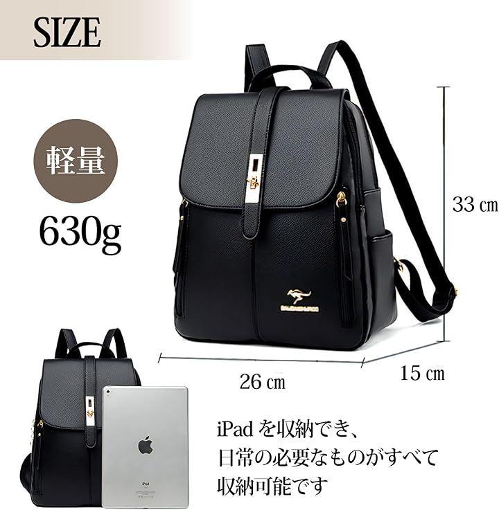 *本体:高さ33x横幅 26x厚さ 15cm(ポケット部含む) 重さ630g *ストラップ長さ調整可能 *素材:PUレザー 裏地:ポリエステル