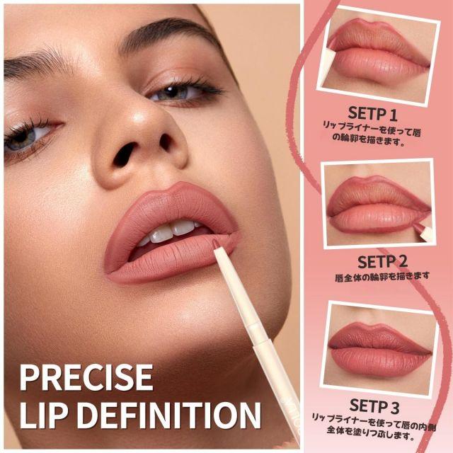 長持ちする着用感長時間落ちないように設計されたこのリップライナーセットは、防水性と防じん性を備えており、一日中着用するのに最適です。頻繁なタッチアップは不要。