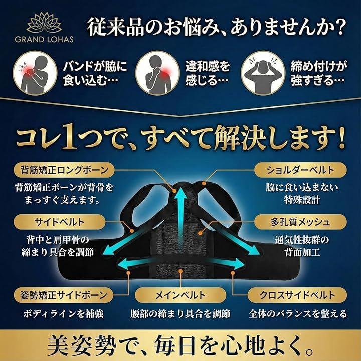 強引な締め付けによる一時的な姿勢維持ではなく、着用しながら綺麗な姿勢に必要な筋肉と体幹を育てるよう設計されたGRAND LOHAS独自の商品です。