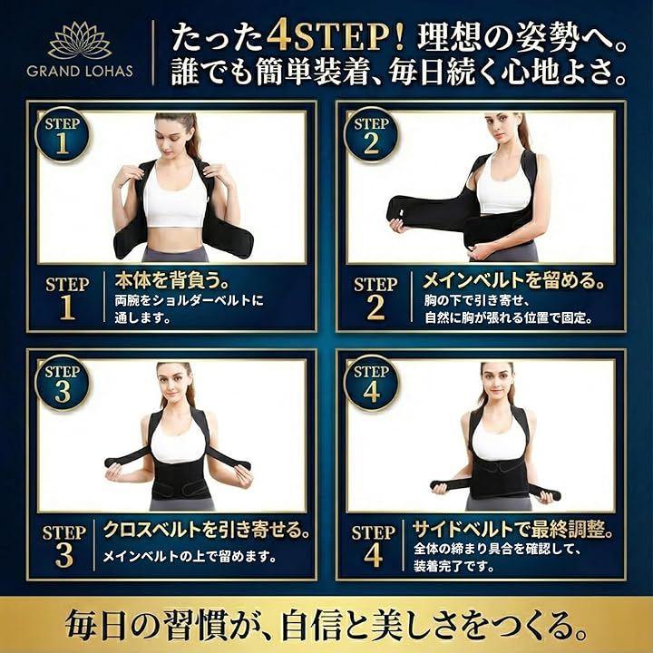 強引な締め付けによる一時的な姿勢維持ではなく、着用しながら綺麗な姿勢に必要な筋肉と体幹を育てるよう設計されたGRAND LOHAS独自の商品です。