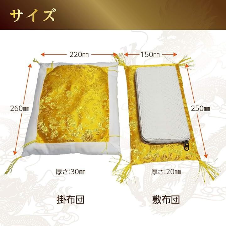 布団生地には風水神獣で強力なパワーを放つ五本爪の黄金龍「 皇帝龍 」を配した金運財布布団です。