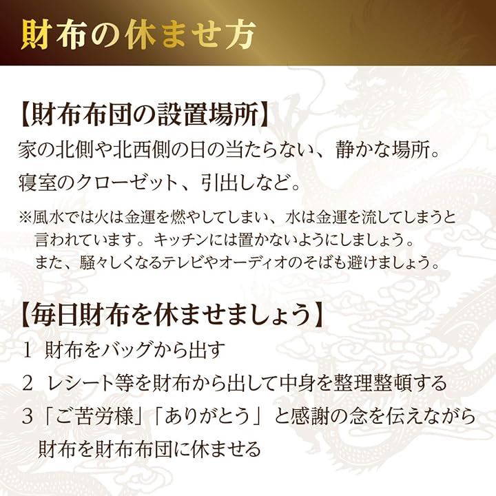 「用途」金運財布はもとより、現金や通帳、宝くじや馬券、開運ブレス等の開運グッズをゆったりと寝かせ。大きな金運ご利益をお招き下さい。