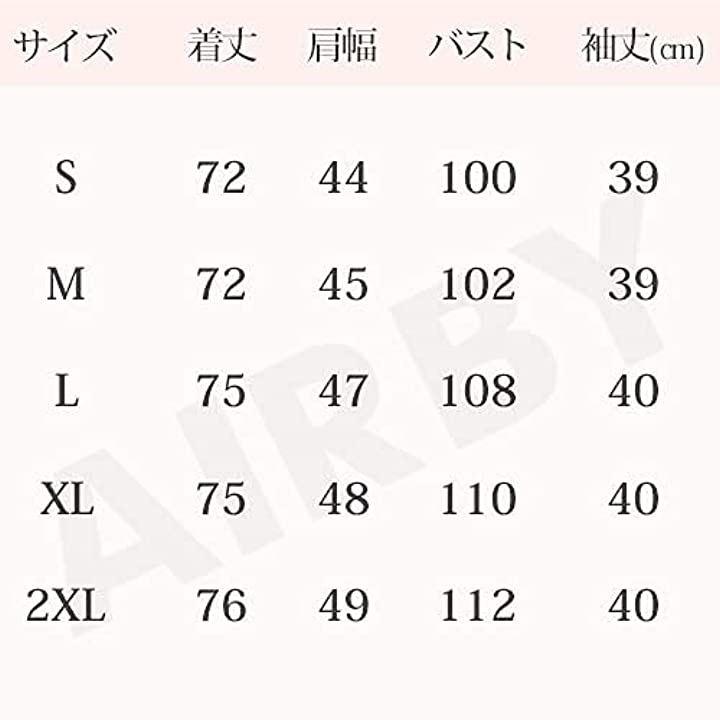 ・サイズ:着丈/肩幅/胸囲/袖丈(cm)「S」72/44/100/39「M」72/45/102/39「L」75/47/108/40「XL」75/48/110/40「2XL」76/49/112/40