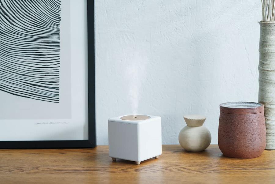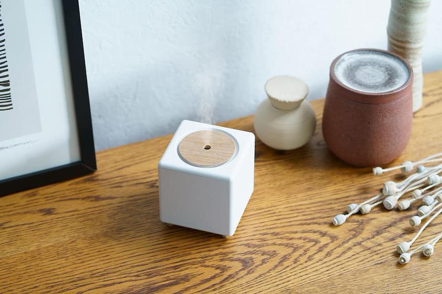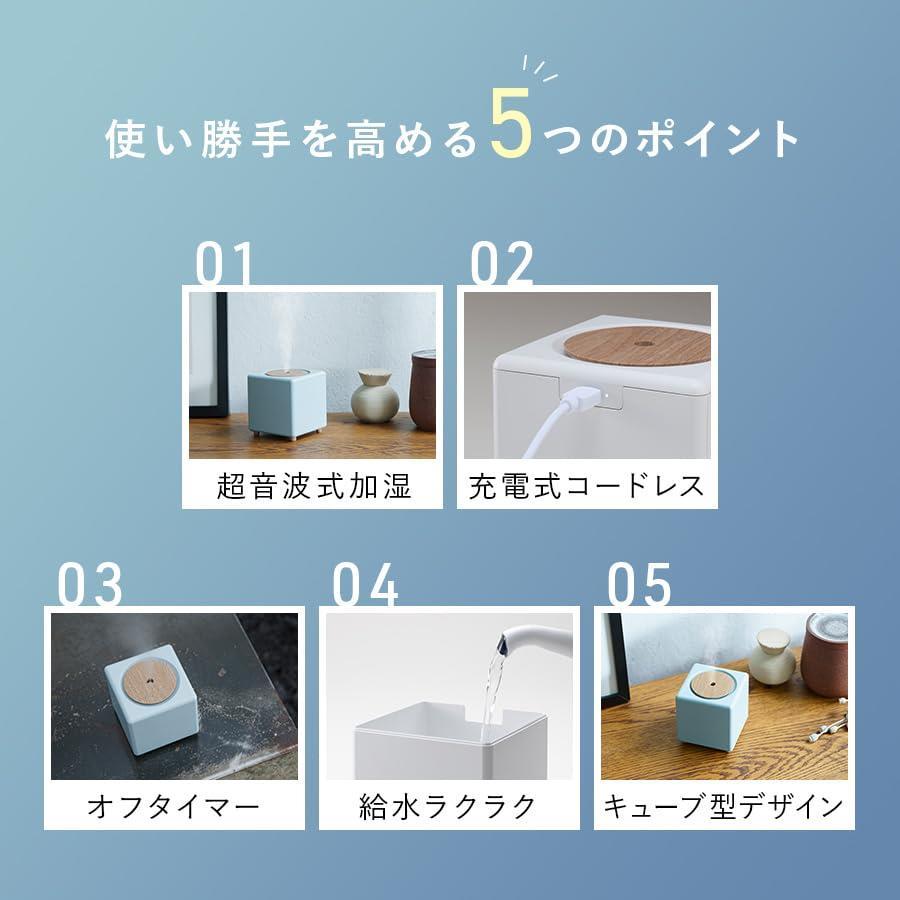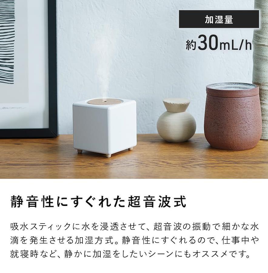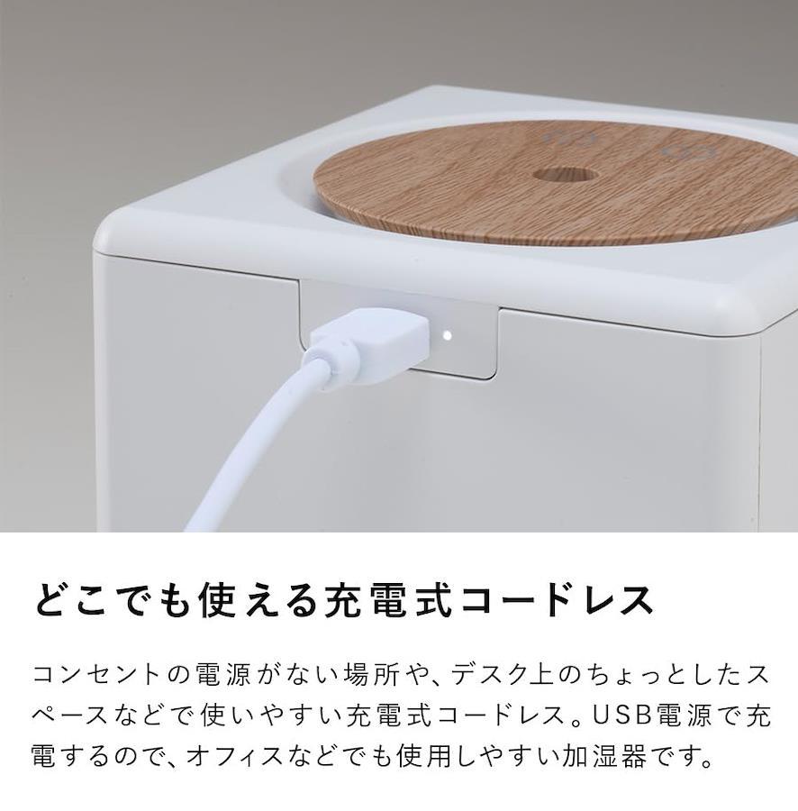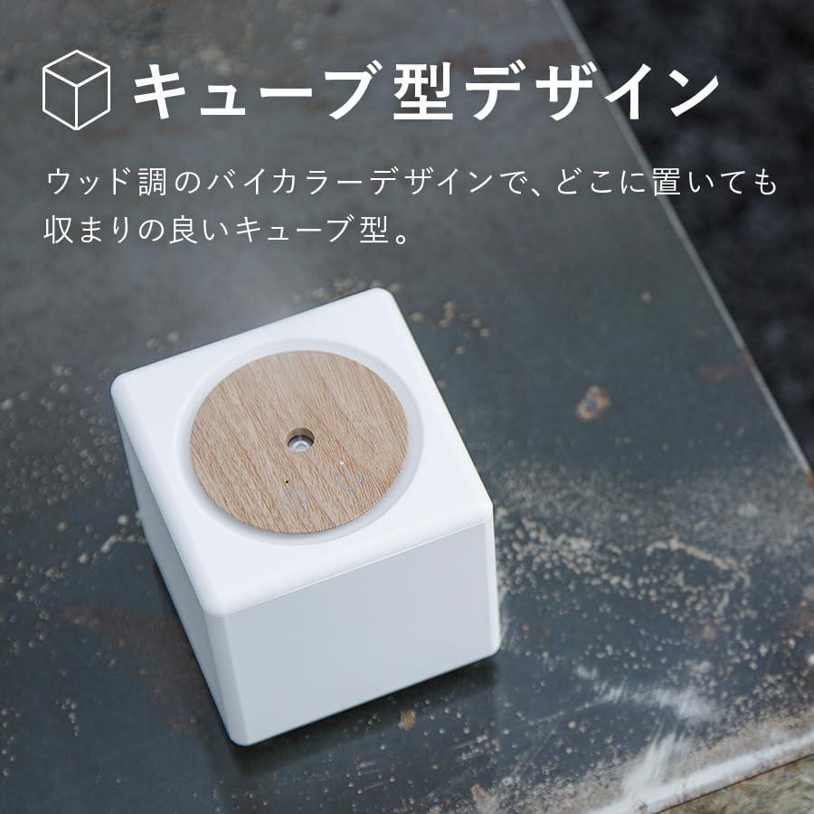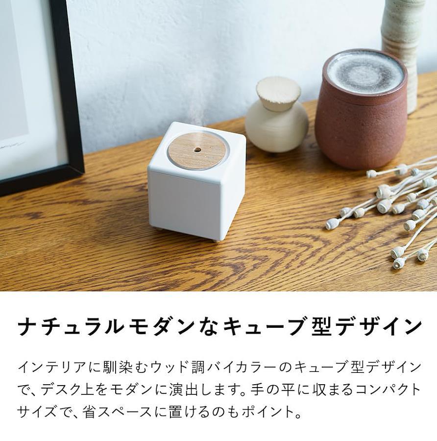 3営業日以内に発送≪新品未開封品≫:デスクのちょっとしたスペースで使えるUSB充電式のパーソナル加湿器「キュービック」。いつでもどこでも手軽に使えるミニサイズで自分だけの潤い空間を演出してくれます。ウッド調バイカラーを取り入れたキューブ型のデザインはお部屋のインテリアとしてもナチュラルモダンな雰囲気を演出してくれます。就寝時に便利なオフタイマー機能も搭載しています。