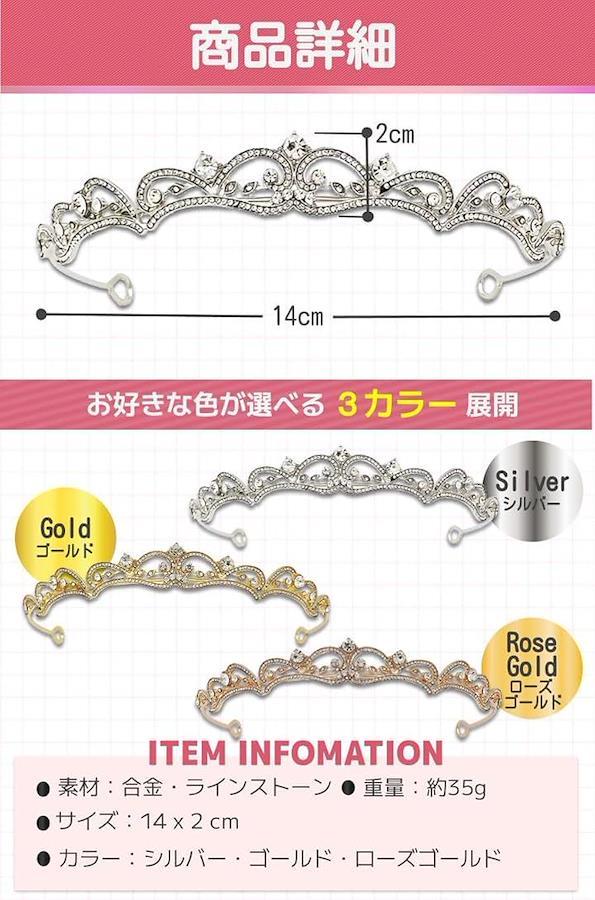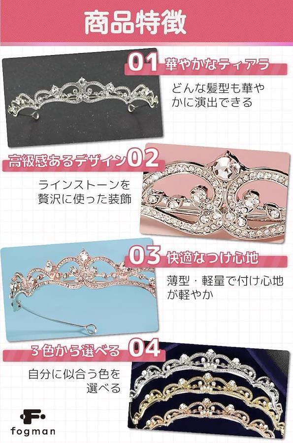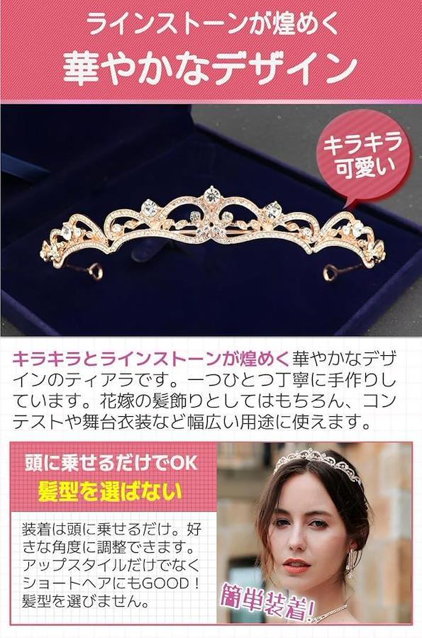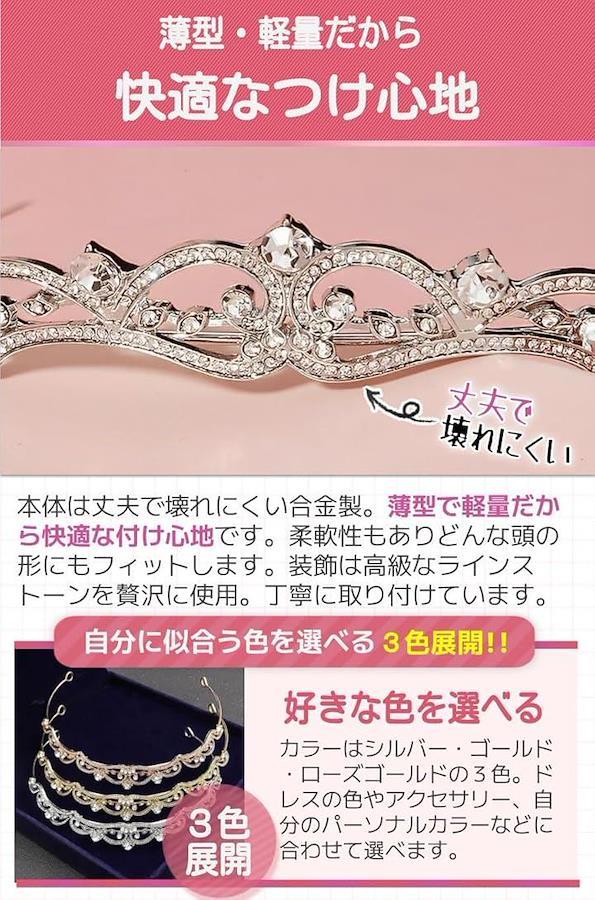 「商品特徴」(1)華やかなティアラ:どんな髪型も華やかに演出できる/(2)高級感あるデザイン:ラインストーンを贅沢に使った装飾/(3)快適なつけ心地:薄型・軽量で付け心地が軽やか/(4)3色から選べる:自分に似合う色を選べる