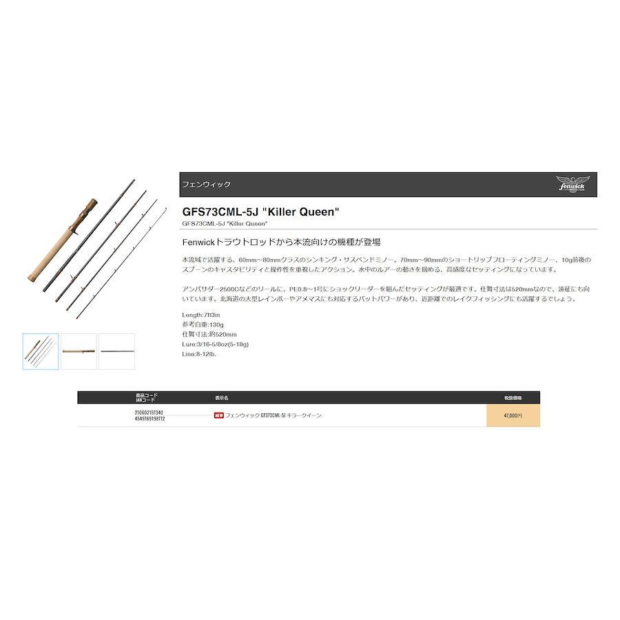 フェンウィック GFS73CML-5J "Killer Queen"Fenwickトラウトロッドから本流向けの機種が登場本流域で活躍する、60mm~80mmクラスのシンキング・サスペンドミノー。70mm~90mmのショートリップフローティングミノー、10g前後のスプーンのキャスタビリティと操作性を重視したアクション。水中のルアーの動きを掴める、高感度なセッティングになっています。