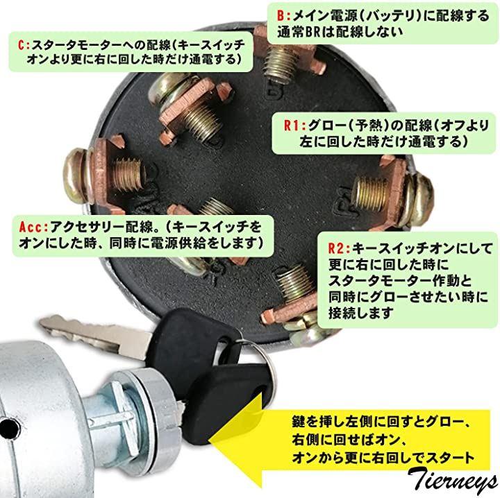 「下部のネジに配線するだけで使用できる汎用キースイッチ」B:メイン電源(バッテリ)に配線する通常BRは配線しないC:スタータモーターへの配線(キースイッチオンより更に右に回した時だけ通電する)R1:グロー(予熱)の配線(オフより左に回した時だけ通電する)R2:キースイッチオンにして更に右に回した時に、スタータモーター作動と同時にグローさせたい時に接続します。