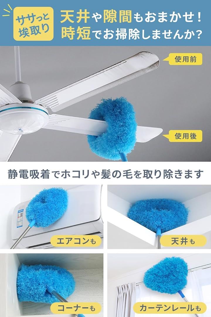 まさに”シーリングファン専用”とも言える中空穴式の埃とりモップです なんといってもその特徴はモップのヘッド部分が、最大18cm幅まで広がる中空穴になっているため、 高いところにあるシーリングファンの表裏両面のホコリや汚れを一度に拭き取ることができます 3本継で、最大144cmまで伸ばすことができるのでご家庭内のシーリングファンなら楽に届いてお手軽にお掃除できます 水洗い可能で、繰り返し使えますので、高所のお掃除に、気になるハウスダストや知らず知らずに溜まっていく室内のほこりの拭き取りにお使いいただけます カラーバリエーションは全部で8色、お好きな色をお選びいただけます