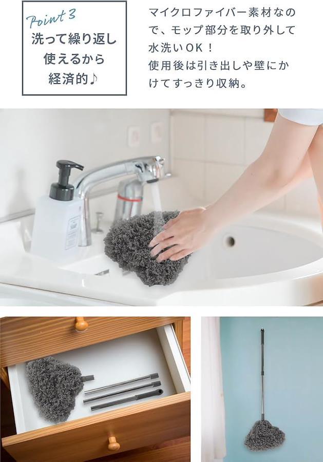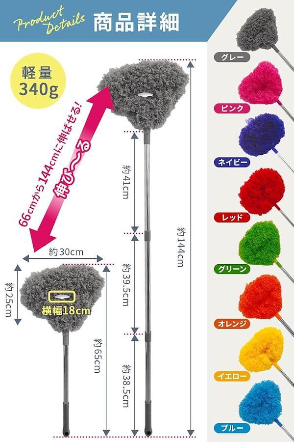 まさに”シーリングファン専用”とも言える中空穴式の埃とりモップです なんといってもその特徴はモップのヘッド部分が、最大18cm幅まで広がる中空穴になっているため、 高いところにあるシーリングファンの表裏両面のホコリや汚れを一度に拭き取ることができます 3本継で、最大144cmまで伸ばすことができるのでご家庭内のシーリングファンなら楽に届いてお手軽にお掃除できます 水洗い可能で、繰り返し使えますので、高所のお掃除に、気になるハウスダストや知らず知らずに溜まっていく室内のほこりの拭き取りにお使いいただけます カラーバリエーションは全部で8色、お好きな色をお選びいただけます