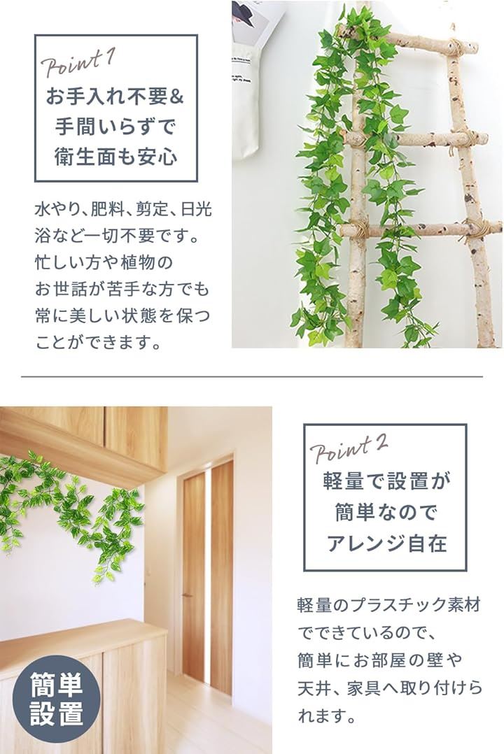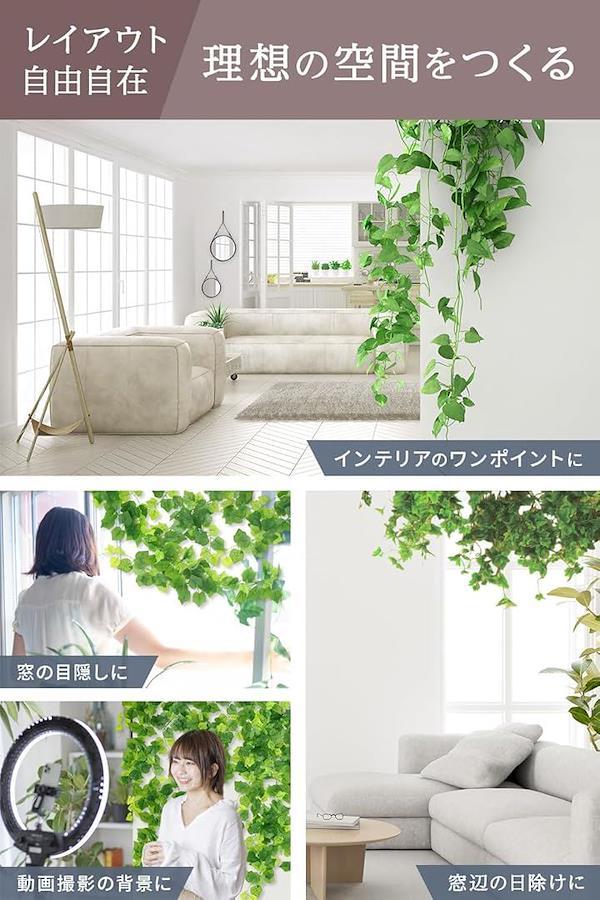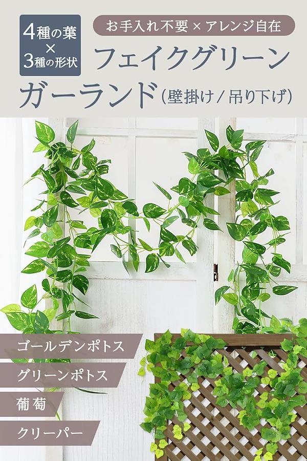 4種類の葉っぱ:ゴールデンポトス、グリーンポトス、クリーパー、葡萄の4種類の葉っぱからお選びいただけます ゴールデンポトスは斑模様のポトス、グリーンポトスは斑の入っていない緑一色のポトスです 3種類の形状、長さ: 2m1本のタイプは葉っぱの数が264枚、蔓の部分に針金が入っているので、自由に折り曲げて飾ることができます。