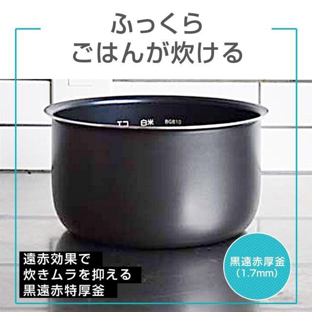 ・ふっくらごはんが炊ける黒遠赤厚釜(1.7mm)…遠赤効果の高い黒厚釜で炊きムラを抑え、ふっくらおいしいごはんを炊きあげます。・省スチーム30%カットエコ炊きメニュー・便利な調理メニューつき…火かげんの難しい本格調理も簡単・便利に。専用なべを使うことなく煮込み料理ができます。例:ビーフシチューなど。
