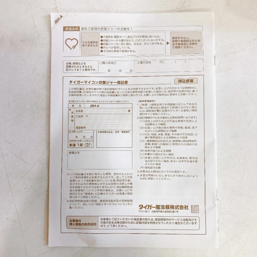 商品名TIGER/タイガー JBH-A100-C 炊きたて(マイコン炊飯ジャー) 5.5合炊き 箱付き