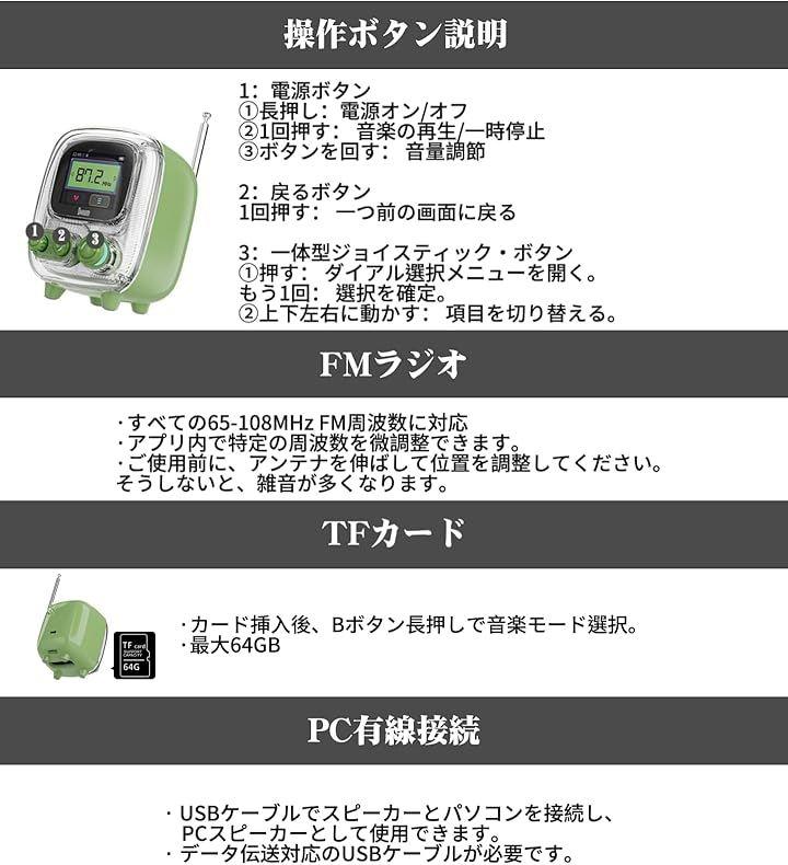 「あなたが手に入れる機能はこちら」(1)3Way 接続:Bluetooth5.3/microSDカード(最大64GB)/PCスピーカー(2)歌詞表示:音楽に合わせて歌詞を楽しめる、スマホスピーカーとしても便利 (3) ピクセルアート再生:Divoomアプリの作品を表示(4) クロックモード:多彩なダイアルを選べるデジ時計 (5)フォト再生:写真をアップロードしてミニフォトフレームに (6)FMラジオ。