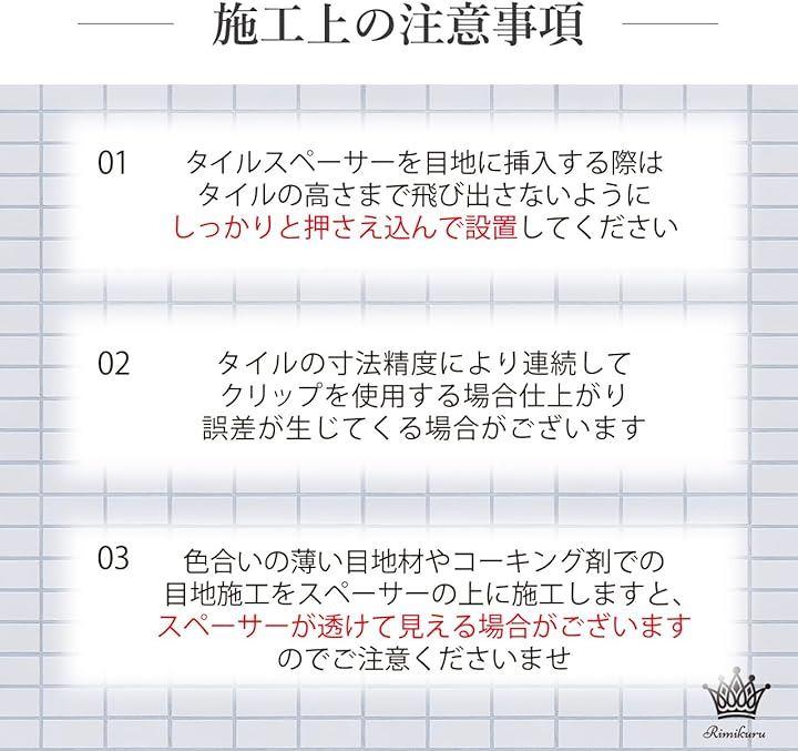 目地のピッチ調整を目的としておりますが、タイルの寸法精度により連続してクリップを使用する場合仕上がり誤差が生じてくる場合がございます。