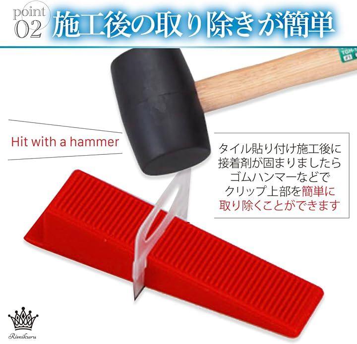 タイル貼り付け施工後に接着剤が固まりましたらゴムハンマーなどでクリップ上部を簡単に取り除くことができます。