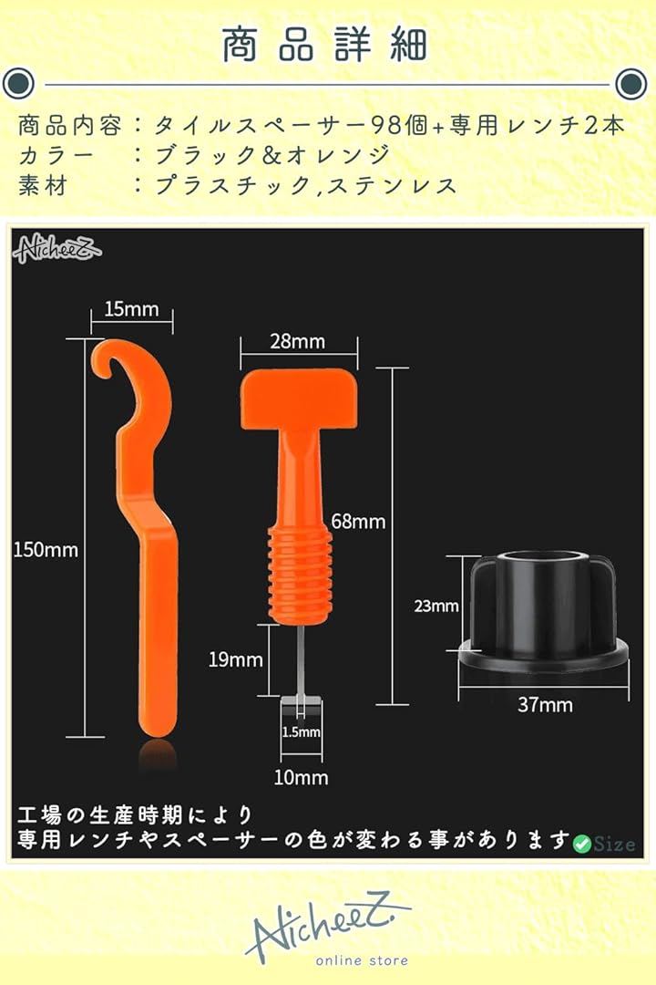 「商品内容」T型タイルレベリングツール セット数:100個+専用レンチ 素材:プラスチック,ステンレス カラー:オレンジ&ブラック サイズ:ネジ部全長/約68mm 幅/約28mm 直径/約37mm