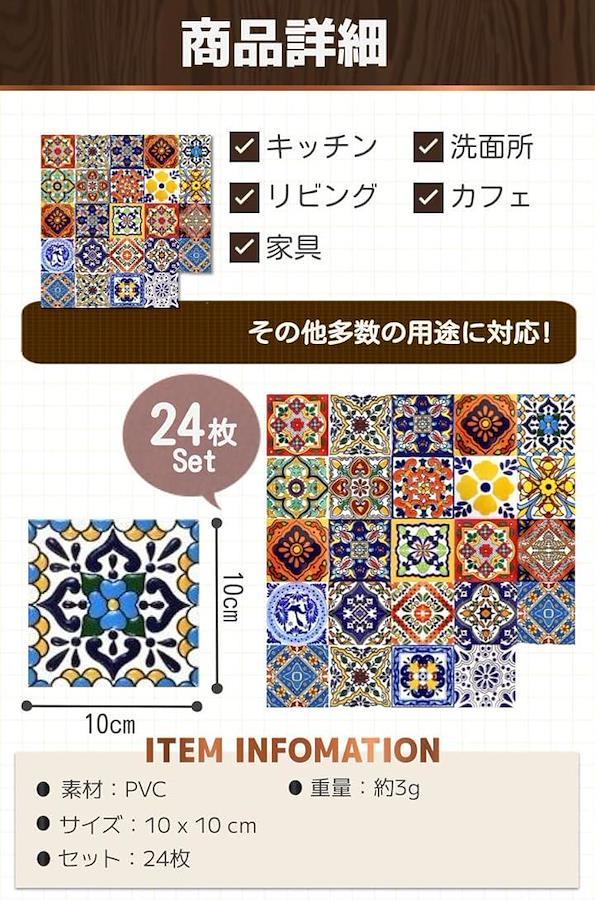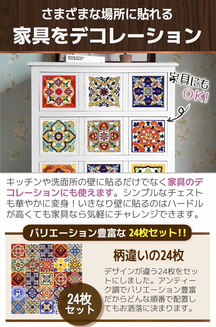 「商品特徴」(1)気軽にリフォーム:壁を華やかにイメージチェンジ/(2)貼るだけ簡単:裏のシートを剥がして圧着するだけ/(3)家具にも貼れる:シンプルな家具を素敵にデコレーション/(4)柄違い24枚セット:バリエーション豊富で配置が楽しい