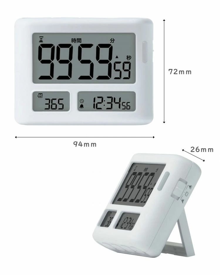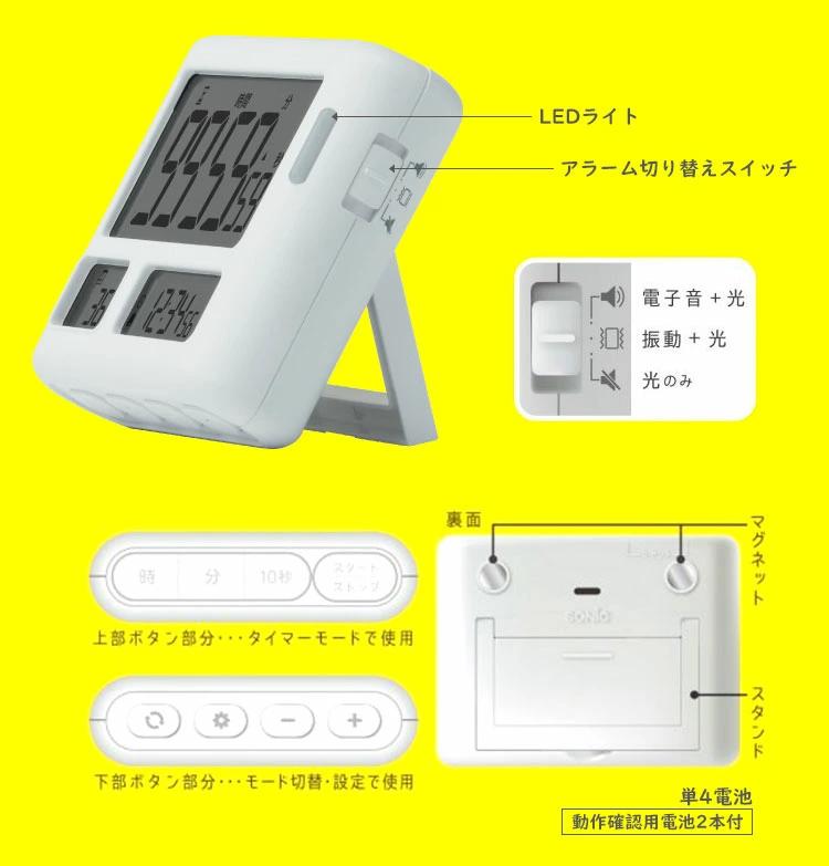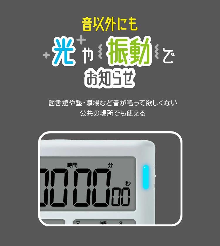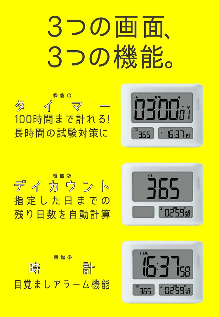 ★時間を意識してやる気・集中力を高められる!タイマー式学習法トキ・サポ!★タイマー・デイカウント・時計の3つの機能を3画面で表示できる。★試験日まであと何日?を自動計算でカウントダウンするデイカウント機能★【めざせ!集中力up!】タイマー式学習法はやわかりガイドブック&365日カレンダーポスターつき。★音のon/off設定が可能で、タイムアップを『光』または『振動』でお知らせします。【アラーム】電子音・振動・消音の切り替え式/アラーム鳴動時間 約60秒【音量】約75db【設定時間】カウントダウン時:最大99時間59分50秒 最小10秒/カウントアップ時:最大99時間59分59秒★見やすい角度で自立するスタンドつき。裏面には磁石付きでスチール面に貼りつきます★お試し用電池付き(単4乾電池×2本)