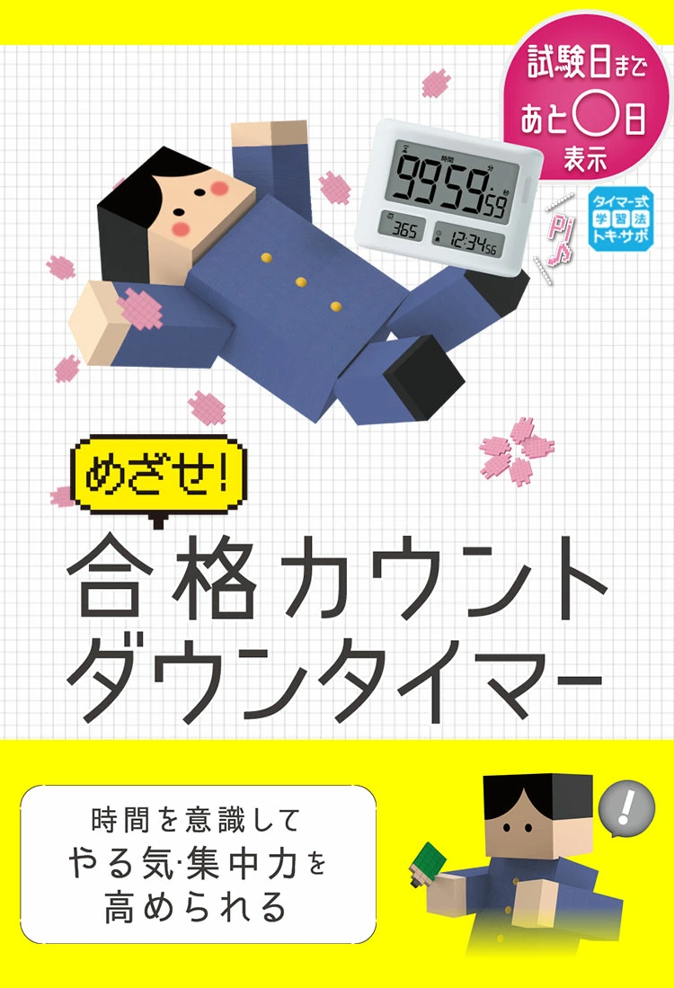 【めざせ合格カウントダウンタイマー】時間を意識してやる気・集中力を高められる!タイマー式学習法トキ・サポ!試験日まであと何日?を自動計算でカウントダウンするデイカウント機能最大100時間まで計れるから、長時間の試験対策に対応!音のon/off設定が可能。消音時は光、または振動でお知らせ!タイマー式学習法はやわかりガイドブック、365日カレンダーポスターつき。